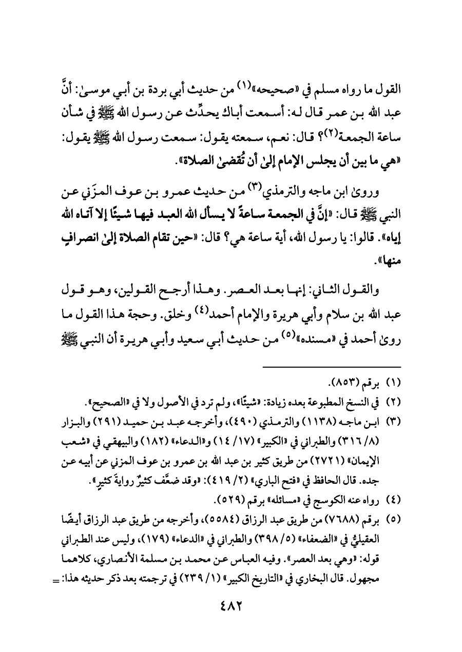 والقول الثاني: إنها بعد العصر. وهذا أرجح القولين، وهو قول عبد الله بن سلام وأبي هريرة والإمام أحمد (¬٤) وخلق. وحجة هذا القول ما روى أحمد في «مسنده» (¬٥) من حديث أبي سعيد وأبي هريرة أن النبي - صلى الله عليه وسلم -
