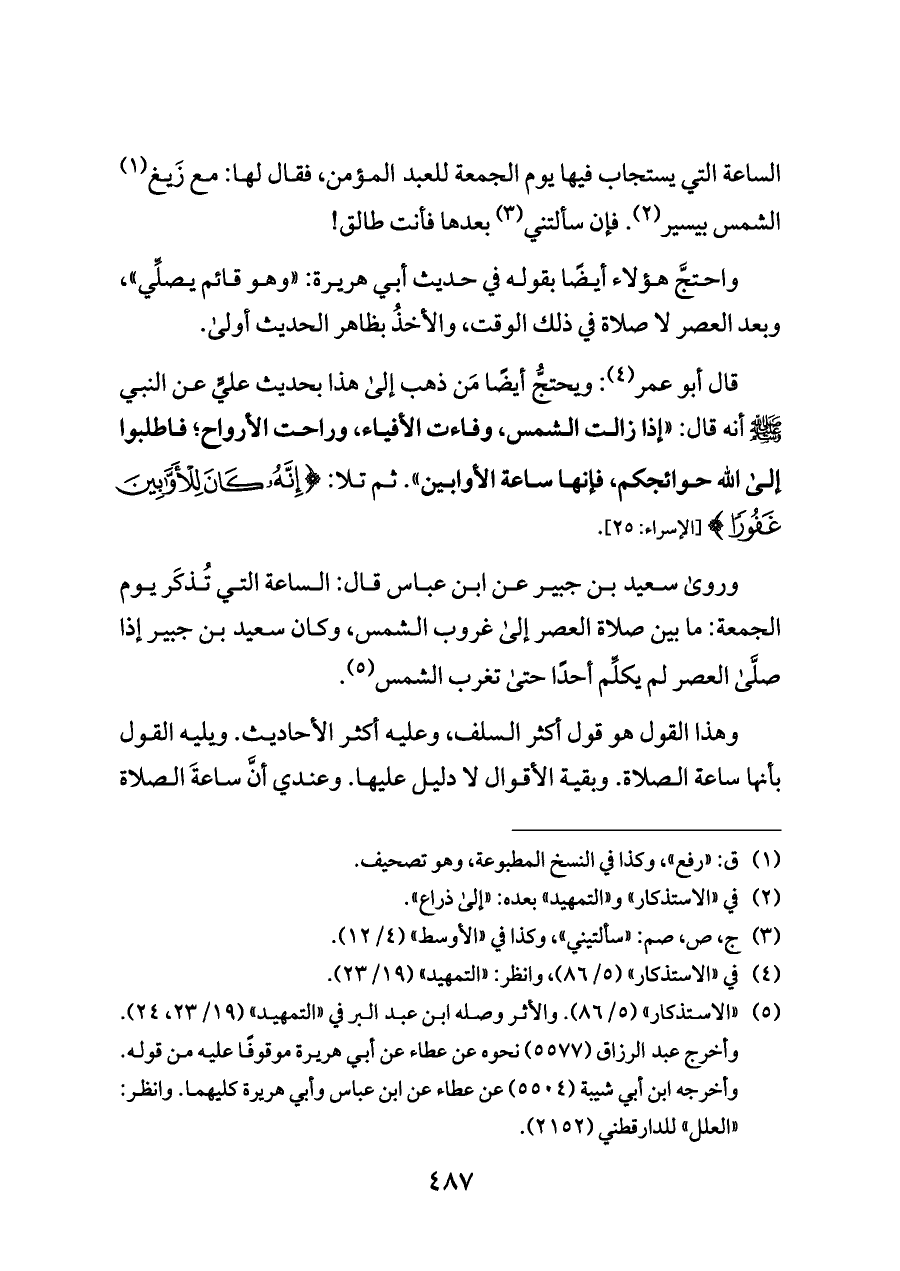 وروى سعيد بن جبير عن ابن عباس قال: الساعة التي تُذكَر يوم الجمعة: ما بين صلاة العصر إلى غروب الشمس، وكان سعيد بن جبير إذا صلَّى العصر لم يكلِّم أحدًا حتى تغرب الشمس (¬٥).