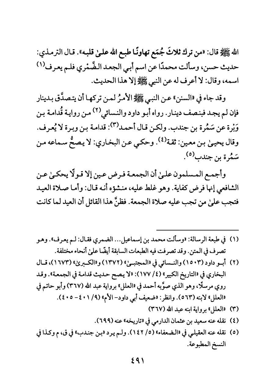 الله - صلى الله عليه وسلم - قال: «من ترك ثلاثَ جُمَع تهاونًا طبع الله على قلبه». قال الترمذي: حديث حسن، وسألت محمدًا عن اسم أبي الجعد الضَّمْري فلم يعرف (¬١) اسمه، وقال: لا أعرف له عن النبي - صلى الله عليه وسلم - إلا هذا الحديث.