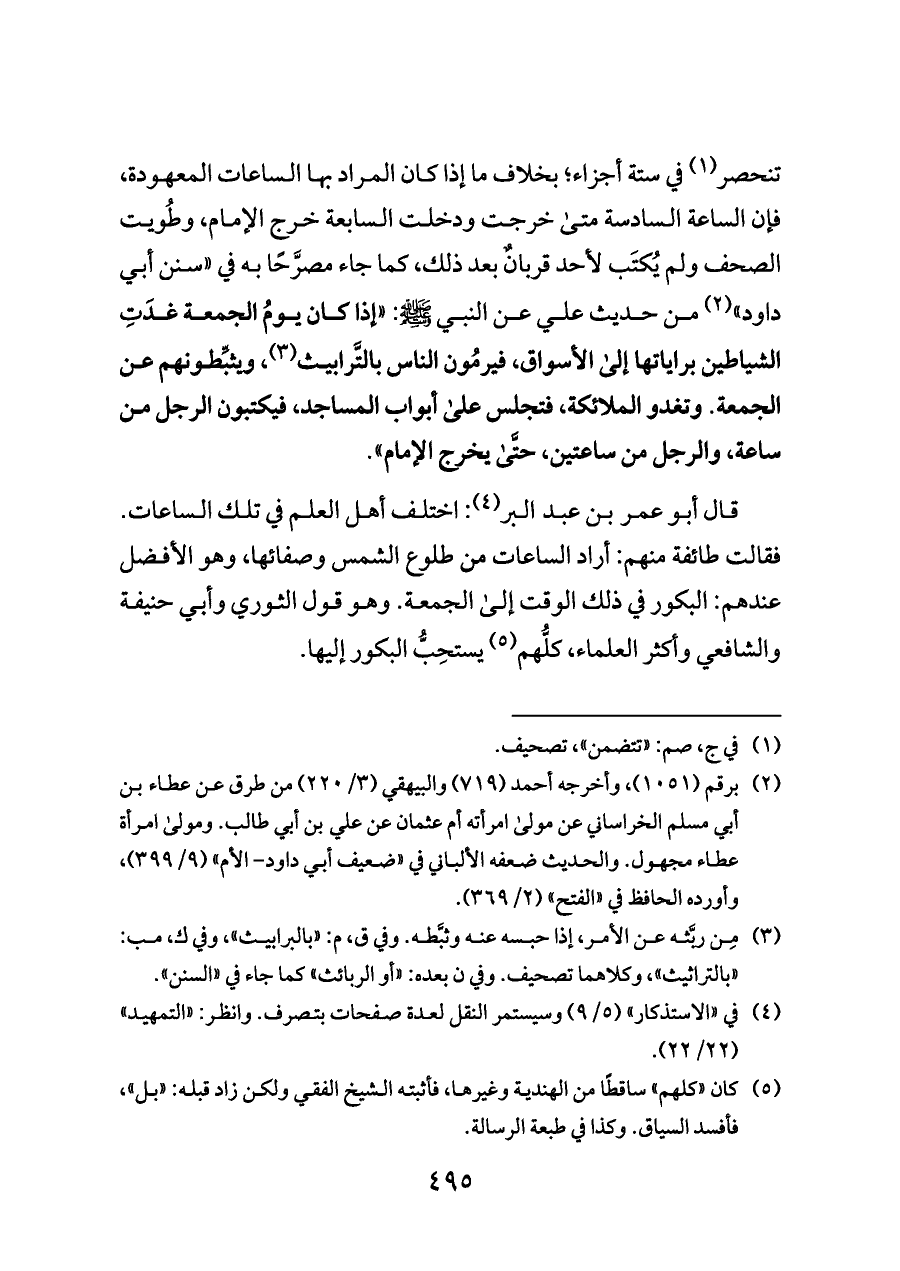 في ستة أجزاء؛ بخلاف ما إذا كان المراد بها الساعات المعهودة، فإن الساعة السادسة متى خرجت ودخلت السابعة خرج الإمام، وطُويت الصحف ولم يُكتَب لأحد قربانٌ بعد ذلك، كما جاء مصرَّحًا به في «سنن أبي داود» (¬٢) من حديث علي عن النبي - صلى الله عليه وسلم -: «إذا كان يومُ الجمعة غدَتِ الشياطين براياتها إلى الأسواق، فيرمُون الناس بالتَّرابيث (¬٣)، ويثبِّطونهم عن الجمعة. وتغدو الملائكة، فتجلس على أبواب المساجد، فيكتبون الرجل من ساعة، والرجل من ساعتين، حتَّى يخرج الإمام».