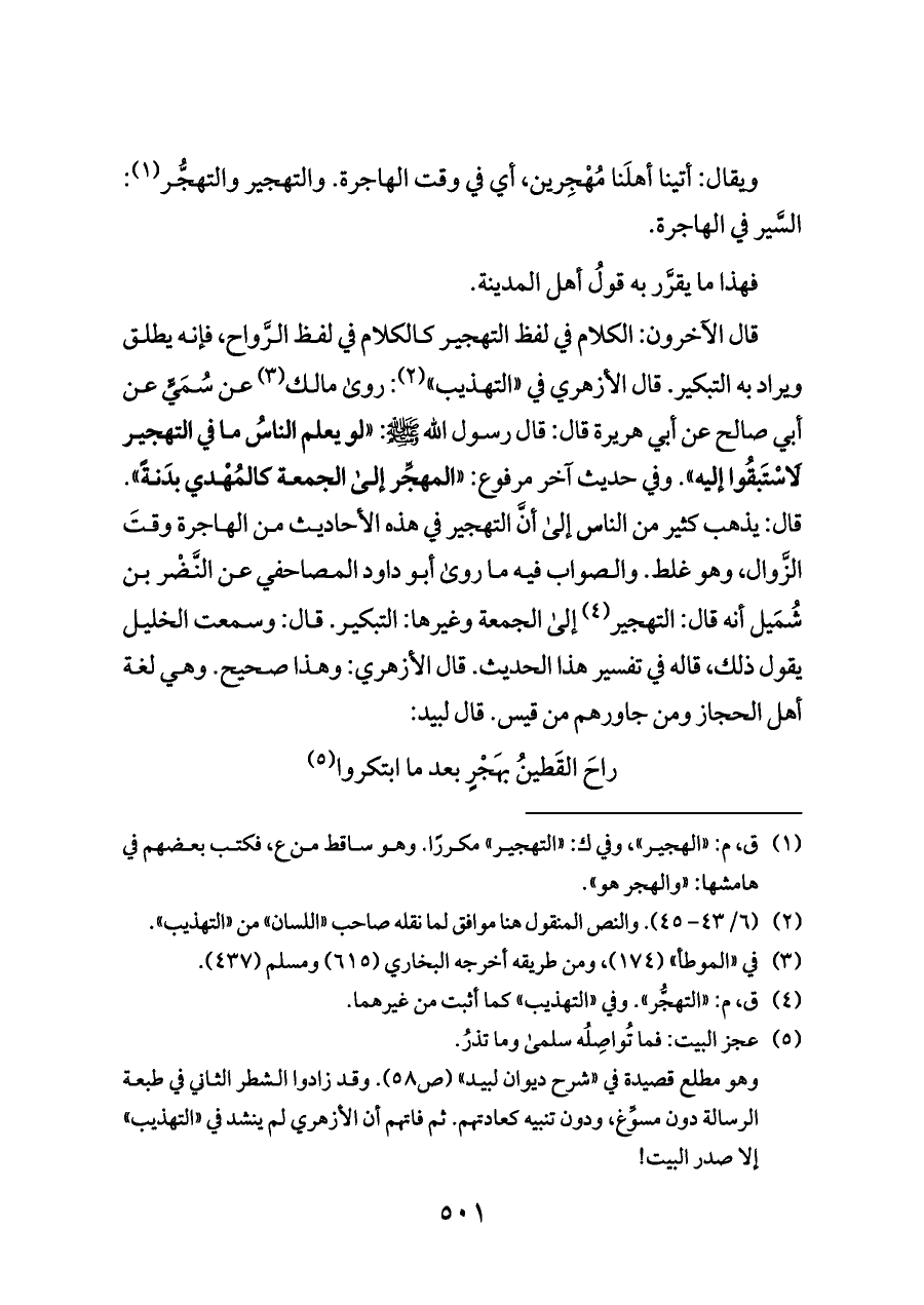 قال الآخرون: الكلام في لفظ التهجير كالكلام في لفظ الرَّواح، فإنه يطلق ويراد به التبكير. قال الأزهري في «التهذيب» (¬٢): روى مالك (¬٣) عن سُمَيٍّ عن أبي صالح عن أبي هريرة قال: قال رسول الله - صلى الله عليه وسلم -: «لو يعلم الناسُ ما في التهجير لَاسْتَبقُوا إليه». وفي حديث آخر مرفوع: «المهجِّر إلى الجمعة كالمُهْدي بدَنةً». قال: يذهب كثير من الناس إلى أنَّ التهجير في هذه الأحاديث من الهاجرة وقتَ الزَّوال، وهو غلط. والصواب فيه ما روى أبو داود المصاحفي عن النَّضْر بن شُمَيل أنه قال: التهجير (¬٤) إلى الجمعة وغيرها: التبكير. قال: وسمعت الخليل يقول ذلك، قاله في تفسير هذا الحديث. قال الأزهري: وهذا صحيح. وهي لغة أهل الحجاز ومن جاورهم من قيس. قال لبيد:
