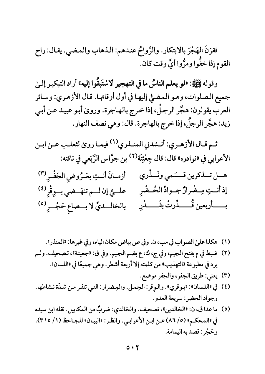 وقوله - صلى الله عليه وسلم -: «لو يعلم الناسُ ما في التهجير لَاسْتَبقُوا إليه» أراد التبكير إلى جميع الصلوات، وهو المضيُّ إليها في أول أوقاتها. قال الأزهري: وسائر العرب يقولون: هجَّر الرجلُ، إذا خرج بالهاجرة. وروى أبو عبيد عن أبي زيد: هجَّر الرجلُ، إذا خرج بالهاجرة. قال: وهي نصف النهار.