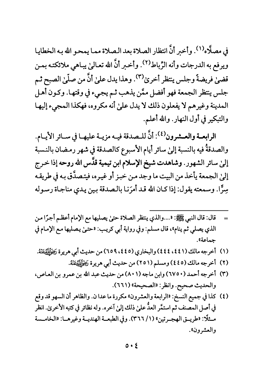 الرابعة والعشرون (¬٤): أنَّ للصدقة فيه مزية عليها في سائر الأيام. والصدقةُ فيه بالنسبة إلى سائر أيام الأسبوع كالصدقة في شهر رمضان بالنسبة إلى سائر الشهور. وشاهدت شيخ الإسلام ابن تيمية قدَّس الله روحه إذا خرج إلى الجمعة يأخذ من البيت ما وجد من خبز أو غيره، فيتصدَّق به في طريقه سِرًّا. وسمعته يقول: إذا كان الله قد أمرَنا بالصدقة بين يدي مناجاة رسوله