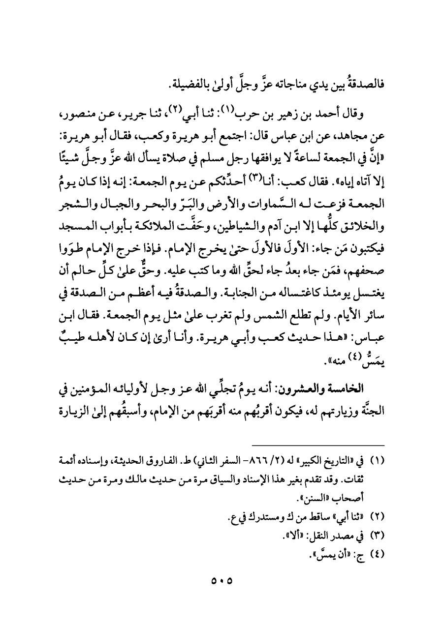 وقال أحمد بن زهير بن حرب (¬١): ثنا أبي (¬٢)، ثنا جرير، عن منصور، عن مجاهد، عن ابن عباس قال: اجتمع أبو هريرة وكعب، فقال أبو هريرة: «إنَّ في الجمعة لساعةً لا يوافقها رجل مسلم في صلاة يسأل الله عزَّ وجلَّ شيئًا إلا آتاه إياه». فقال كعب: أنا (¬٣) أحدِّثكم عن يوم الجمعة: إنه إذا كان يومُ الجمعة فزعت له السَّماوات والأرض والبَرّ والبحر والجبال والشجر والخلائق كلُّها إلا ابن آدم والشياطين، وحَفَّت الملائكة بأبواب المسجد فيكتبون مَن جاء: الأولَ فالأولَ حتى يخرج الإمام. فإذا خرج الإمام طوَوا صحفهم، فمَن جاء بعدُ جاء لحقِّ الله وما كتب عليه. وحقٌّ على كلِّ حالم أن يغتسل يومئذ كاغتساله من الجنابة. والصدقةُ فيه أعظم من الصدقة في سائر الأيام. ولم تطلع الشمس ولم تغرب على مثل يوم الجمعة. فقال ابن عباس: «هذا حديث كعب وأبي هريرة. وأنا أرى إن كان لأهله طيبٌ يمَسُّ (¬٤) منه».