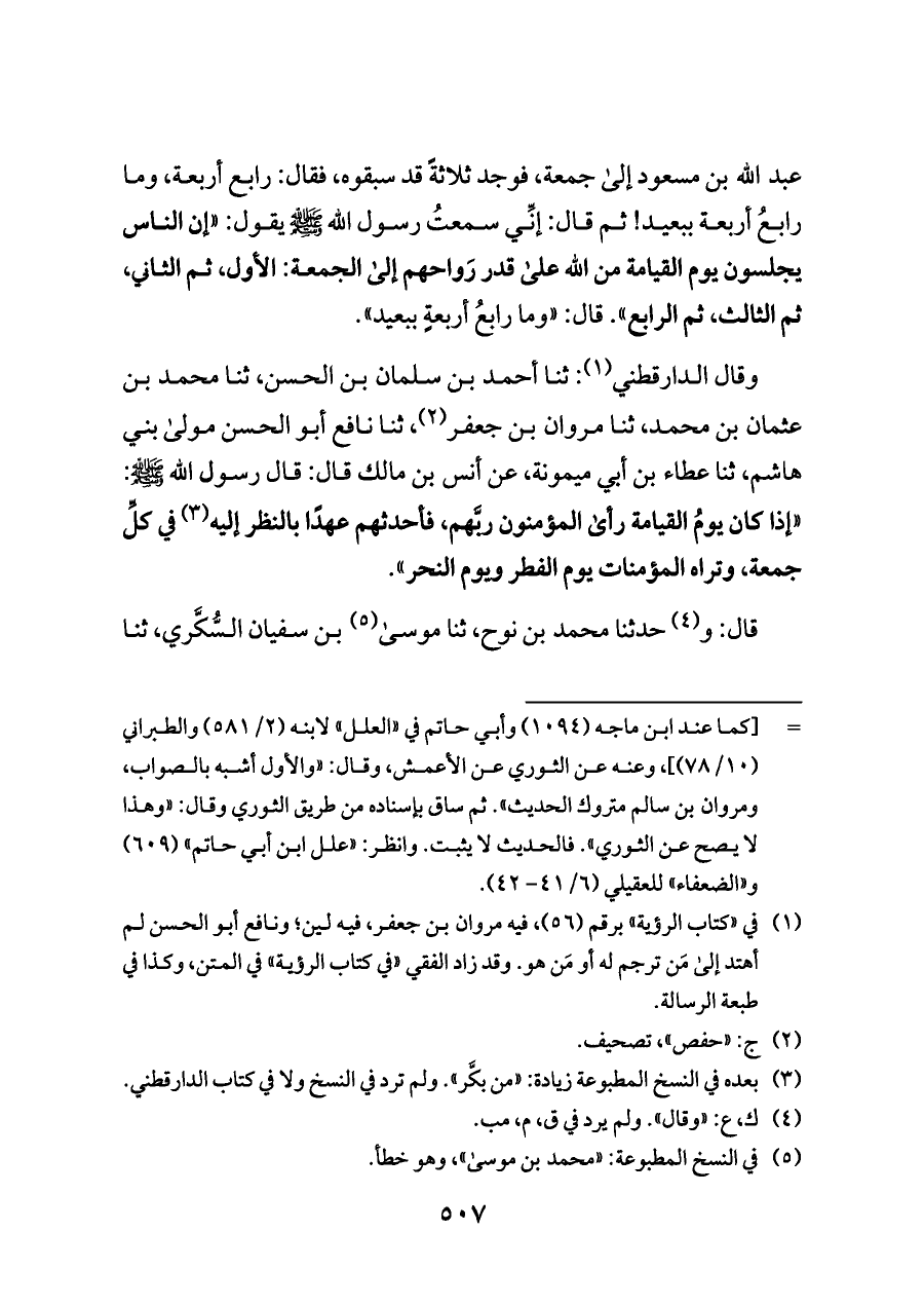 (¬١) في «كتاب الرؤية» برقم (٥٦)، فيه مروان بن جعفر، فيه لين؛ ونافع أبو الحسن لم أهتد إلى مَن ترجم له أو مَن هو. وقد زاد الفقي «في كتاب الرؤية» في المتن، وكذا في طبعة الرسالة.
