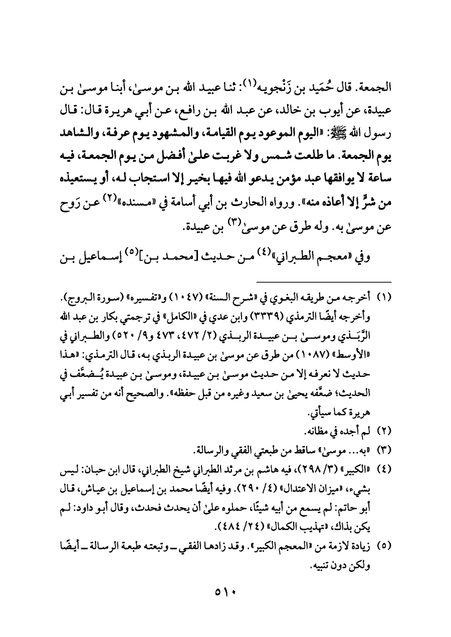 الجمعة. قال حُمَيد بن زَنْجويه (¬١): ثنا عبيد الله بن موسى، أبنا موسى بن عبيدة، عن أيوب بن خالد، عن عبد الله بن رافع، عن أبي هريرة قال: قال رسول الله - صلى الله عليه وسلم -: «اليوم الموعود يوم القيامة، والمشهود يوم عرفة، والشاهد يوم الجمعة. ما طلعت شمس ولا غربت على أفضل من يوم الجمعة، فيه ساعة لا يوافقها عبد مؤمن يدعو الله فيها بخير إلا استجاب له، أو يستعيذه من شرٍّ إلا أعاذه منه». ورواه الحارث بن أبي أسامة في «مسنده» (¬٢) عن رَوح عن موسى به. وله طرق عن موسى (¬٣) بن عبيدة.