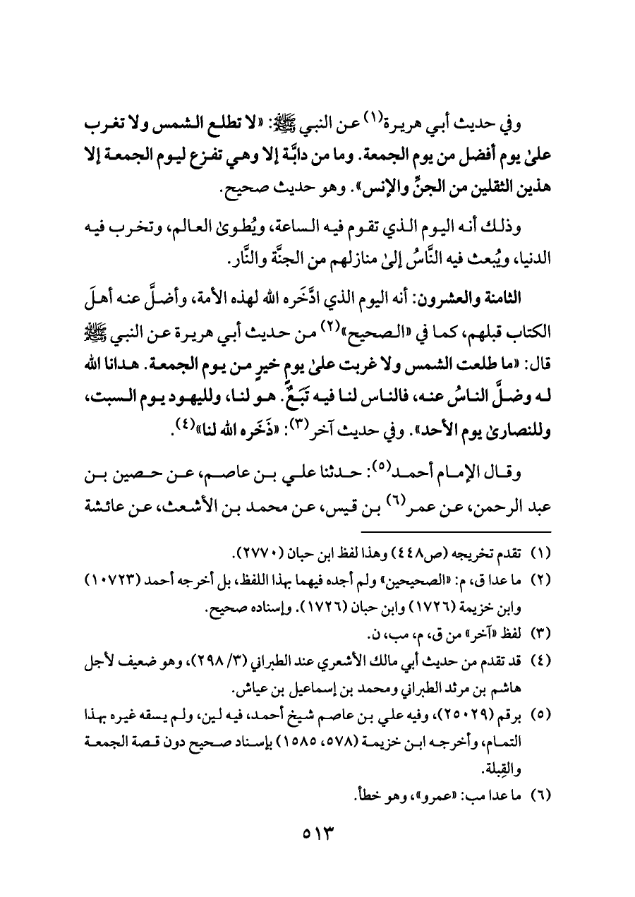وفي حديث أبي هريرة (¬١) عن النبي - صلى الله عليه وسلم -: «لا تطلع الشمس ولا تغرب على يوم أفضل من يوم الجمعة. وما من دابَّة إلا وهي تفزع ليوم الجمعة إلا هذين الثقلين من الجنِّ والإنس». وهو حديث صحيح.