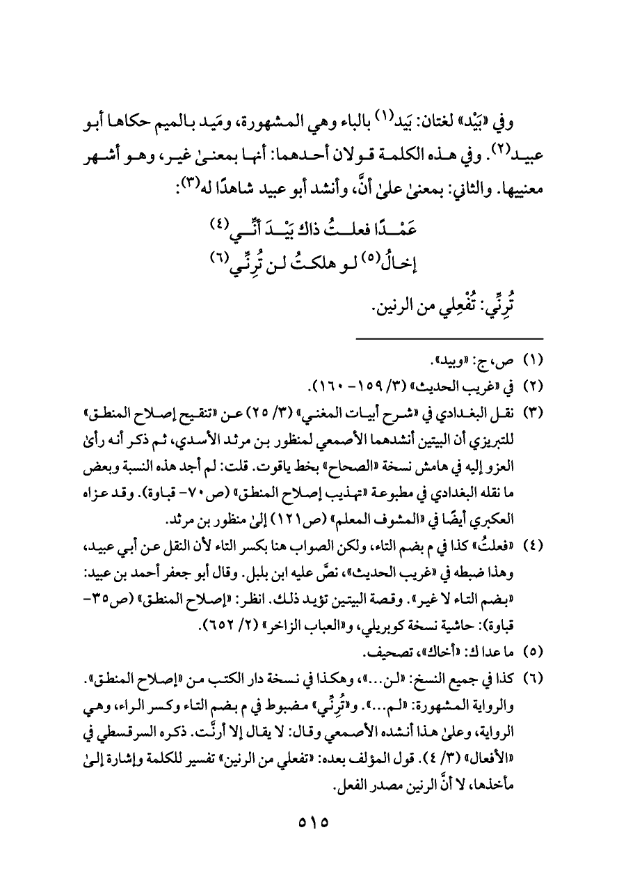 (¬٤) «فعلتُ» كذا في م بضم التاء، ولكن الصواب هنا بكسر التاء لأن النقل عن أبي عبيد، وهذا ضبطه في «غريب الحديث»، نصَّ عليه ابن بلبل. وقال أبو جعفر أحمد بن عبيد: «بضم التاء لا غير». وقصة البيتين تؤيد ذلك. انظر: «إصلاح المنطق» (ص ٣٥ - قباوة): حاشية نسخة كوبريلي، و «العباب الزاخر» (٢/ ٦٥٢).