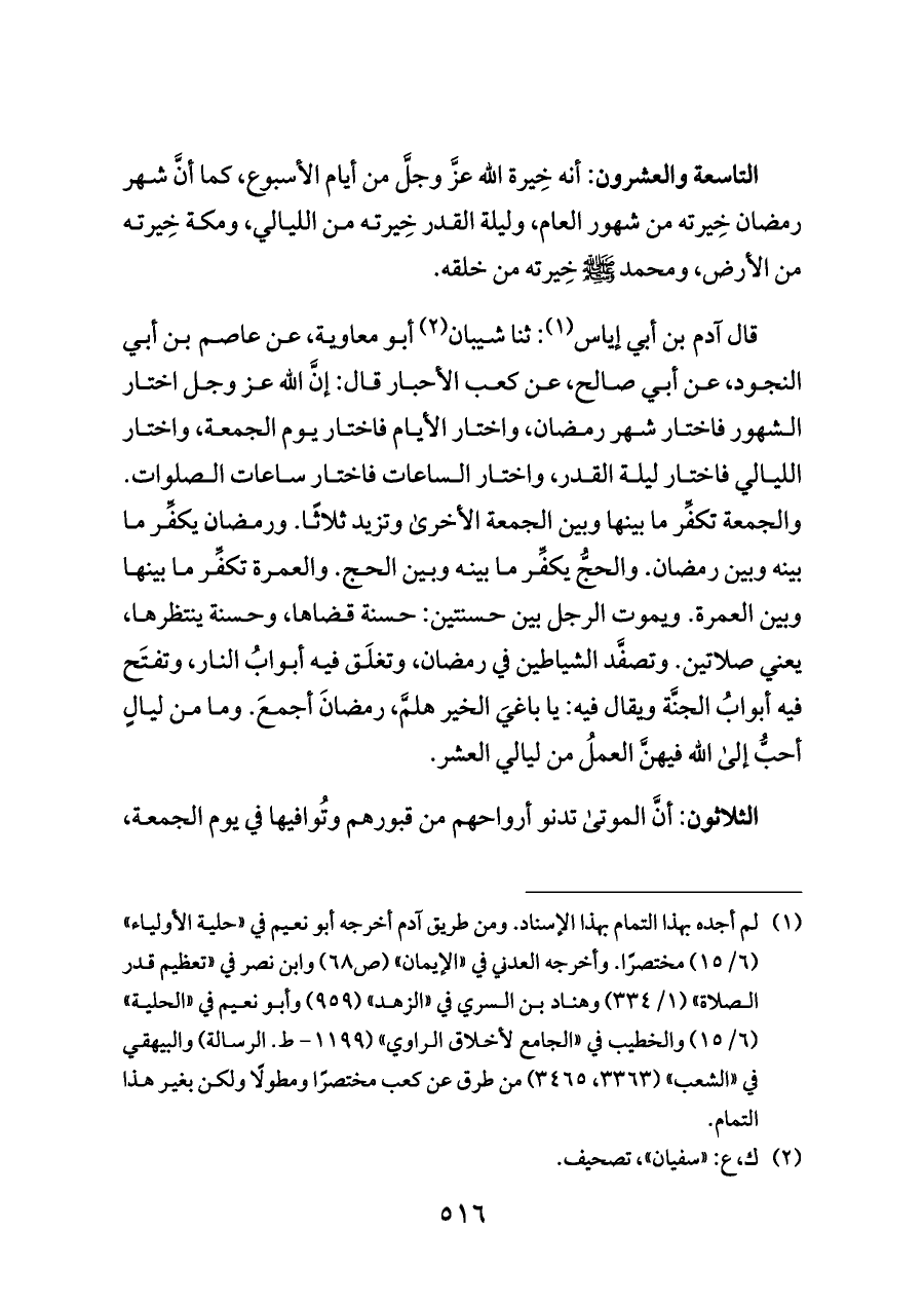 قال آدم بن أبي إياس (¬١): ثنا شيبان (¬٢) أبو معاوية، عن عاصم بن أبي النجود، عن أبي صالح، عن كعب الأحبار قال: إنَّ الله عز وجل اختار الشهور فاختار شهر رمضان، واختار الأيام فاختار يوم الجمعة، واختار الليالي فاختار ليلة القدر، واختار الساعات فاختار ساعات الصلوات. والجمعة تكفِّر ما بينها وبين الجمعة الأخرى وتزيد ثلاثًا. ورمضان يكفِّر ما بينه وبين رمضان. والحجُّ يكفِّر ما بينه وبين الحج. والعمرة تكفِّر ما بينها وبين العمرة. ويموت الرجل بين حسنتين: حسنة قضاها، وحسنة ينتظرها، يعني صلاتين. وتصفَّد الشياطين في رمضان، وتغلَق فيه أبوابُ النار، وتفتَح فيه أبوابُ الجنَّة ويقال فيه: يا باغيَ الخير هلمَّ، رمضانَ أجمعَ. وما من ليالٍ أحبُّ إلى الله فيهنَّ العملُ من ليالي العشر.