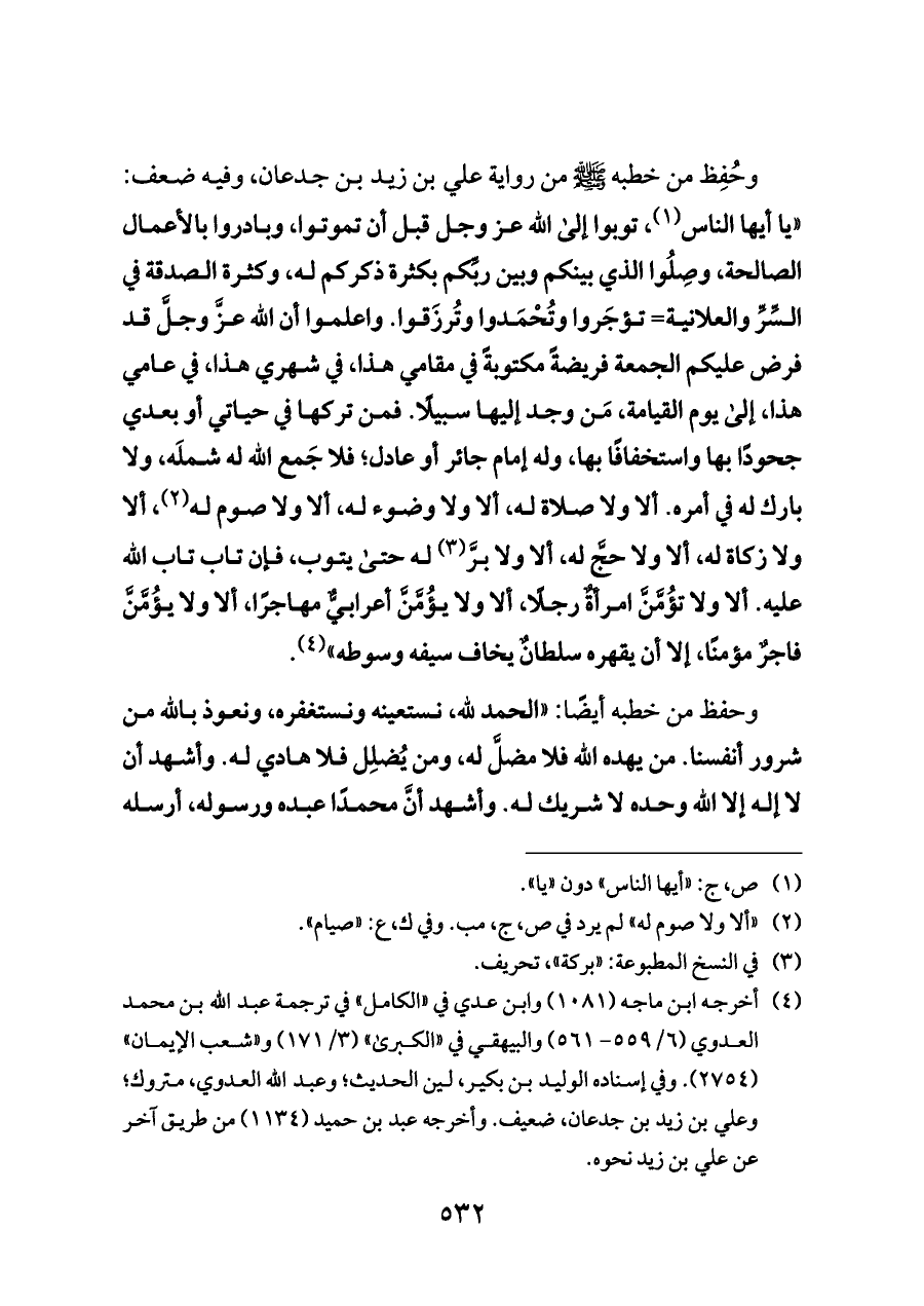 وحُفِظ من خطبه - صلى الله عليه وسلم - من رواية علي بن زيد بن جدعان، وفيه ضعف: «يا أيها الناس (¬١)، توبوا إلى الله عز وجل قبل أن تموتوا، وبادروا بالأعمال الصالحة، وصِلُوا الذي بينكم وبين ربِّكم بكثرة ذكركم له، وكثرة الصدقة في السِّرِّ والعلانية= تؤجَروا وتُحْمَدوا وتُرزَقوا. واعلموا أن الله عزَّ وجلَّ قد فرض عليكم الجمعة فريضةً مكتوبةً في مقامي هذا، في شهري هذا، في عامي هذا، إلى يوم القيامة، مَن وجد إليها سبيلًا. فمن تركها في حياتي أو بعدي جحودًا بها واستخفافًا بها، وله إمام جائر أو عادل؛ فلا جَمع الله له شملَه، ولا بارك له في أمره. ألا ولا صلاة له، ألا ولا وضوء له، ألا ولا صوم له (¬٢)، ألا ولا زكاة له، ألا ولا حجَّ له، ألا ولا برَّ (¬٣) له حتى يتوب، فإن تاب تاب الله عليه. ألا ولا تؤُمَّنَّ امرأةٌ رجلًا، ألا ولا يؤُمَّنَّ أعرابيٌّ مهاجرًا، ألا ولا يؤُمَّنَّ فاجرٌ مؤمنًا، إلا أن يقهره سلطانٌ يخاف سيفه وسوطه» (¬٤).