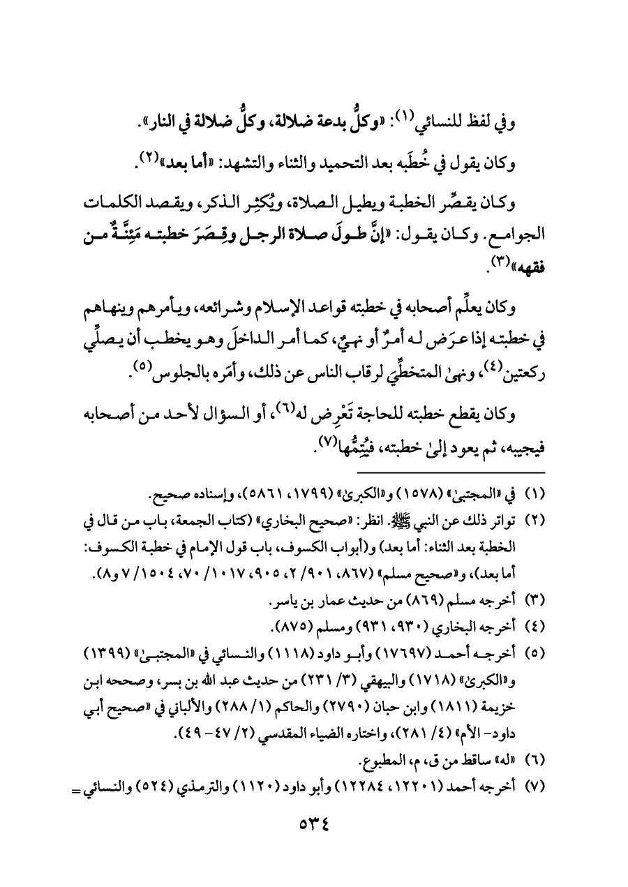 (¬٢) تواتر ذلك عن النبي - صلى الله عليه وسلم -. انظر: «صحيح البخاري» (كتاب الجمعة، باب من قال في الخطبة بعد الثناء: أما بعد) و (أبواب الكسوف، باب قول الإمام في خطبة الكسوف: أما بعد)، و «صحيح مسلم» (٨٦٧، ٩٠١/ ٢، ٩٠٥، ١٠١٧/ ٧٠، ١٥٠٤/ ٧ و ٨).