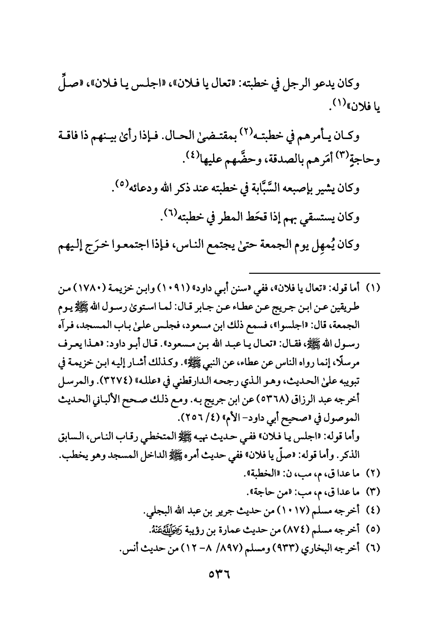 (¬١) أما قوله: «تعال يا فلان»، ففي «سنن أبي داود» (١٠٩١) وابن خزيمة (١٧٨٠) من طريقين عن ابن جريج عن عطاء عن جابر قال: لما استوى رسول الله - صلى الله عليه وسلم - يوم الجمعة، قال: «اجلسوا»، فسمع ذلك ابن مسعود، فجلس على باب المسجد، فرآه رسول الله - صلى الله عليه وسلم -، فقال: «تعال يا عبد الله بن مسعود». قال أبو داود: «هذا يعرف مرسلًا، إنما رواه الناس عن عطاء، عن النبي - صلى الله عليه وسلم -». وكذلك أشار إليه ابن خزيمة في تبويبه على الحديث، وهو الذي رجحه الدارقطني في «علله» (٣٢٧٤). والمرسل أخرجه عبد الرزاق (٥٣٦٨) عن ابن جريج به. ومع ذلك صحح الألباني الحديث الموصول في «صحيح أبي داود- الأم» (٤/ ٢٥٦).