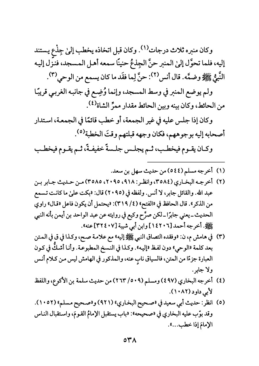 وكان منبره ثلاث درجات (¬١). وكان قبل اتخاذه يخطب إلى جِذْعٍ يستند إليه، فلما تحوَّل إلى المنبر حنَّ الجِذعُ حنينًا سمعه أهل المسجد، فنزل إليه النَّبيُّ - صلى الله عليه وسلم - وضمَّه. قال أنس (¬٢): حنَّ لِما فقَد ما كان يسمع من الوحي (¬٣).