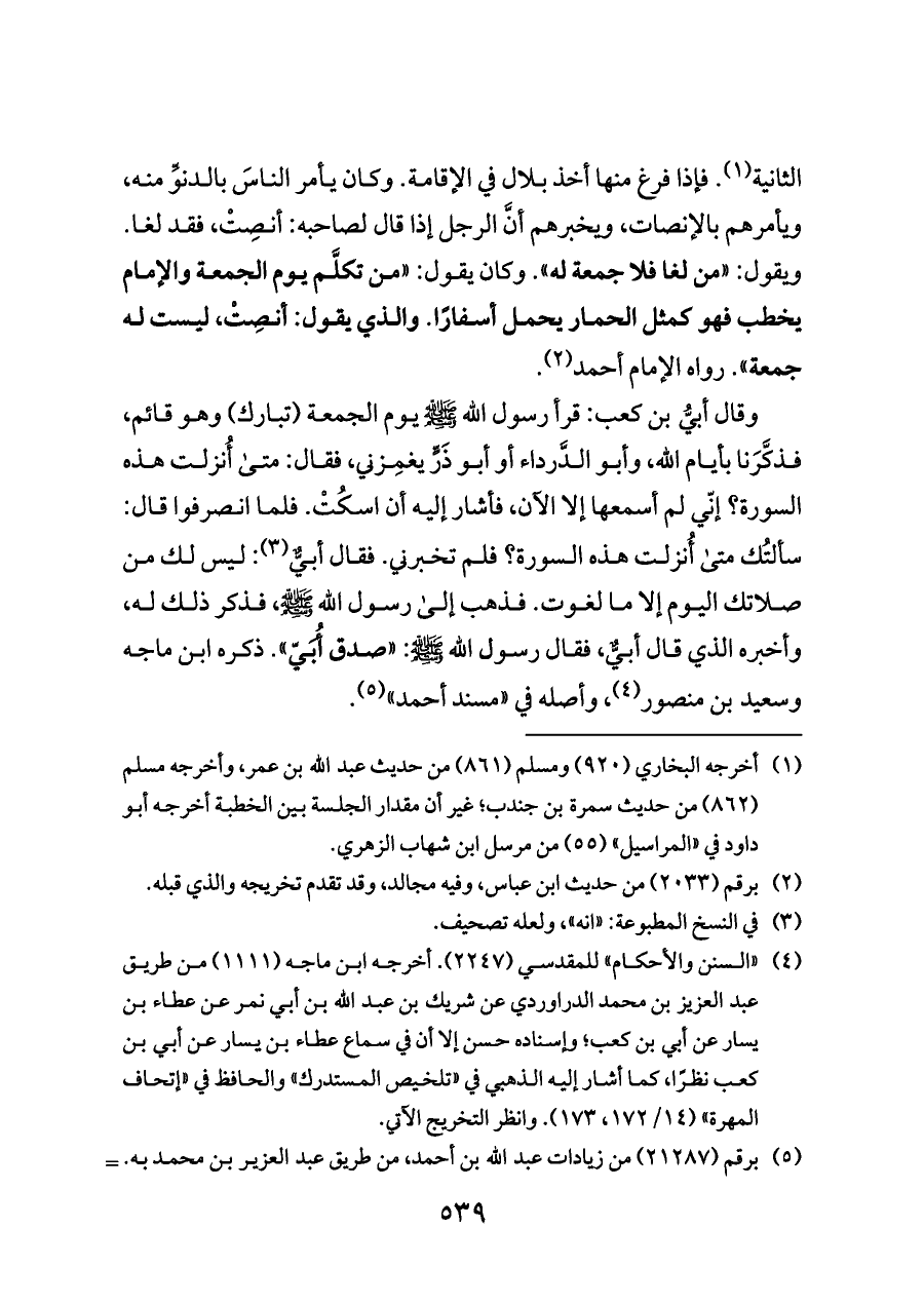 الثانية (¬١). فإذا فرغ منها أخذ بلال في الإقامة. وكان يأمر الناسَ بالدنوِّ منه، ويأمرهم بالإنصات، ويخبرهم أنَّ الرجل إذا قال لصاحبه: أنصِتْ، فقد لغا. ويقول: «من لغا فلا جمعة له». وكان يقول: «من تكلَّم يوم الجمعة والإمام يخطب فهو كمثل الحمار يحمل أسفارًا. والذي يقول: أنصِتْ، ليست له جمعة». رواه الإمام أحمد (¬٢).