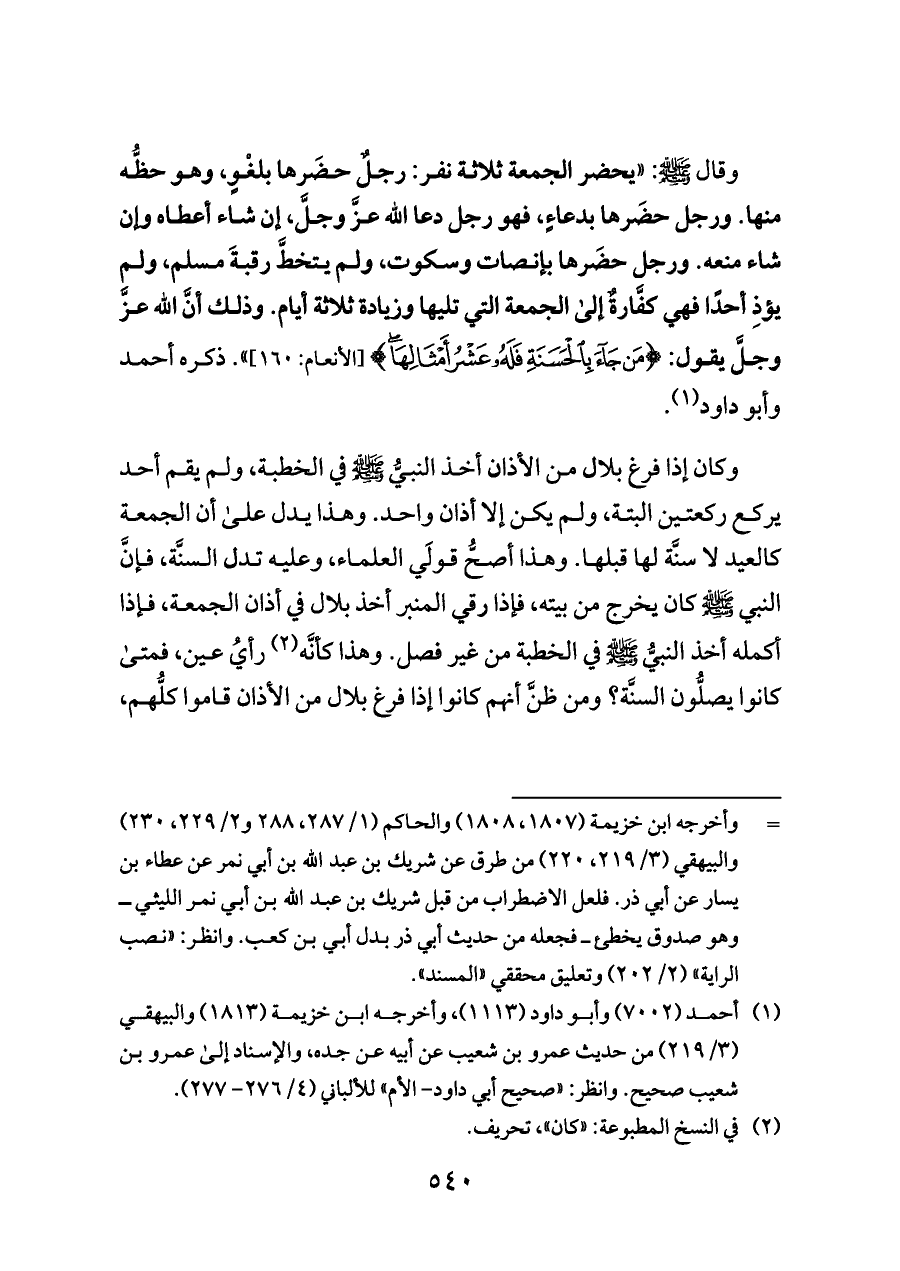 وقال - صلى الله عليه وسلم -: «يحضر الجمعة ثلاثة نفر: رجلٌ حضَرها بلغْوٍ، وهو حظُّه منها. ورجل حضَرها بدعاءٍ، فهو رجل دعا الله عزَّ وجلَّ، إن شاء أعطاه وإن شاء منعه. ورجل حضَرها بإنصات وسكوت، ولم يتخطَّ رقبةَ مسلم، ولم يؤذِ أحدًا فهي كفَّارةٌ إلى الجمعة التي تليها وزيادة ثلاثة أيام. وذلك أنَّ الله عزَّ وجلَّ يقول: {مَنْ جَاءَ بِالْحَسَنَةِ فَلَهُ عَشْرُ أَمْثَالِهَا} [الأنعام: ١٦٠]». ذكره أحمد وأبو داود (¬١).