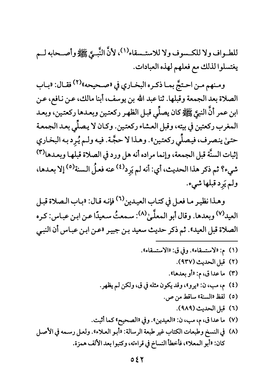 وهذا نظير ما فعل في كتاب العيدين (¬٦) فإنه قال: «باب الصلاة قبل العيد (¬٧) وبعدها. وقال أبو المعلَّى (¬٨): سمعتُ سعيدًا عن ابن عباس: كره الصلاة قبل العيد». ثم ذكر حديث سعيد بن جبير «عن ابن عباس أن النبي