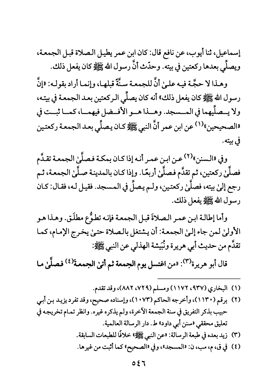 إسماعيل، ثنا أيوب، عن نافع قال: كان ابن عمر يطيل الصلاة قبل الجمعة، ويصلِّي بعدها ركعتين في بيته. وحدّث أنَّ رسول الله - صلى الله عليه وسلم - كان يفعل ذلك.