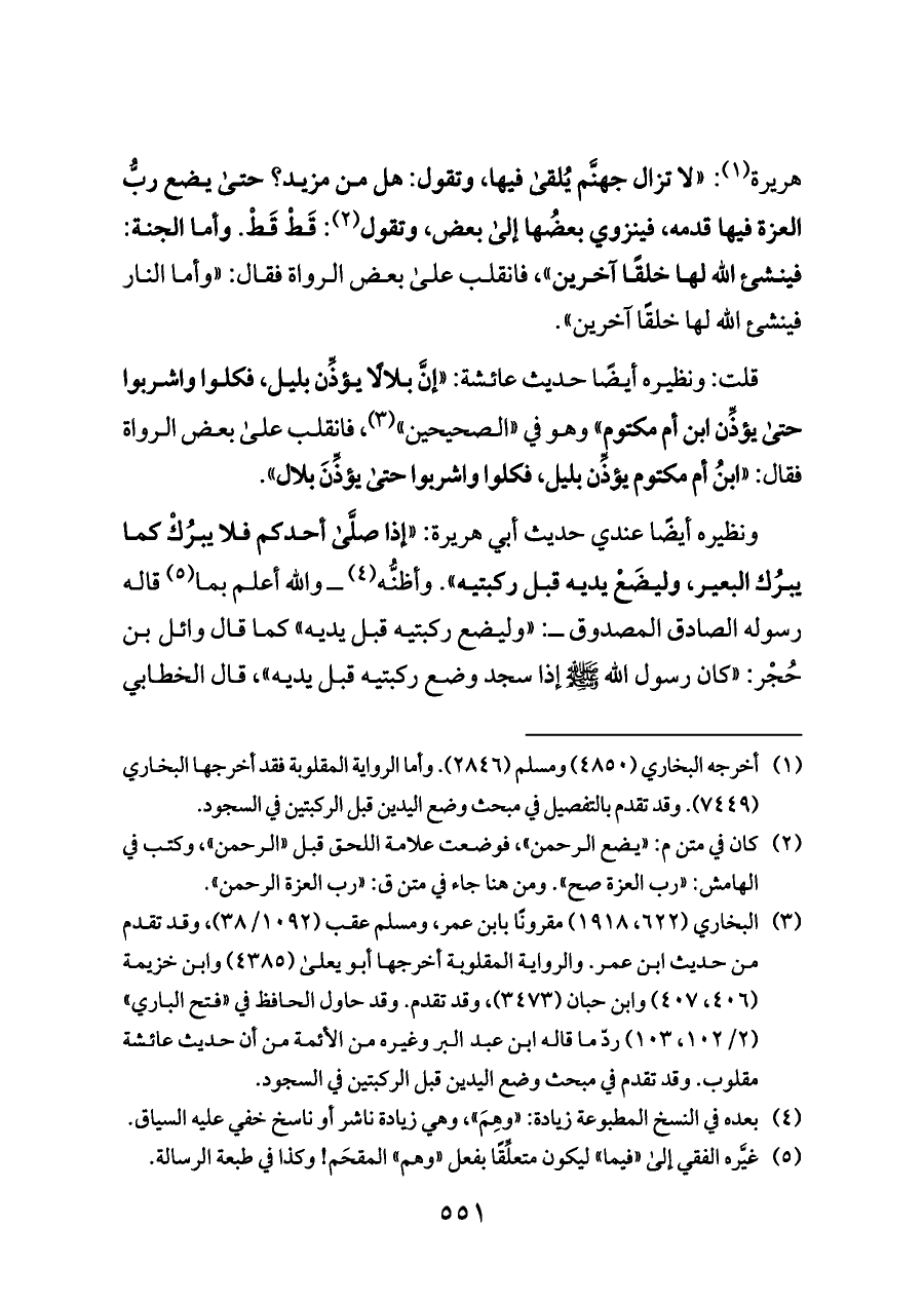 ونظيره أيضًا عندي حديث أبي هريرة: «إذا صلَّى أحدكم فلا يبرُكْ كما يبرُك البعير، وليضَعْ يديه قبل ركبتيه». وأظنُّه (¬٤) ــ والله أعلم بما (¬٥) قاله رسوله الصادق المصدوق ــ: «وليضع ركبتيه قبل يديه» كما قال وائل بن حُجْر: «كان رسول الله - صلى الله عليه وسلم - إذا سجد وضع ركبتيه قبل يديه»، قال الخطابي