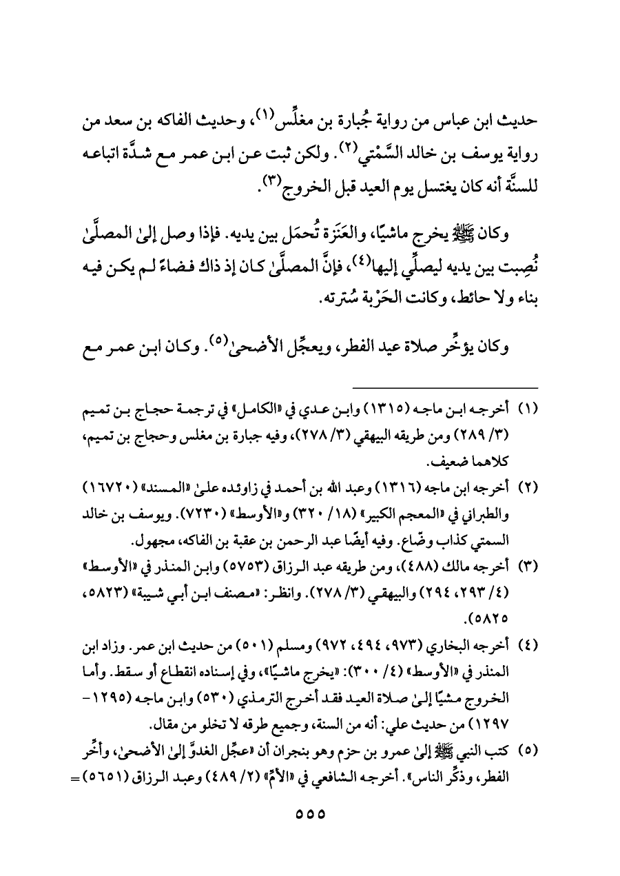 حديث ابن عباس من رواية جُبارة بن مغلِّس (¬١)، وحديث الفاكه بن سعد من رواية يوسف بن خالد السَّمْتي (¬٢). ولكن ثبت عن ابن عمر مع شدَّة اتباعه للسنَّة أنه كان يغتسل يوم العيد قبل الخروج (¬٣).