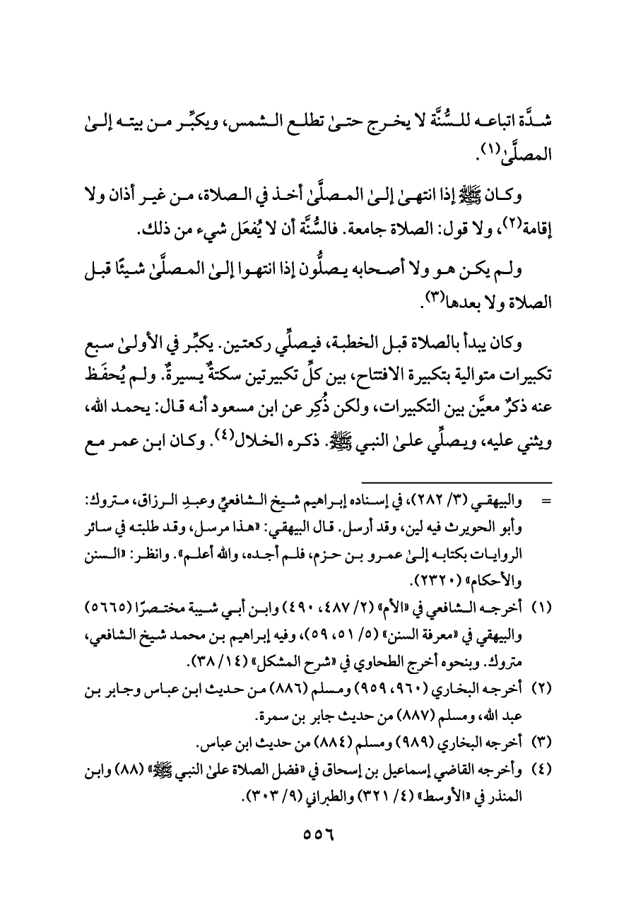 ولم يكن هو ولا أصحابه يصلُّون إذا انتهوا إلى المصلَّى شيئًا قبل الصلاة ولا بعدها (¬٣).