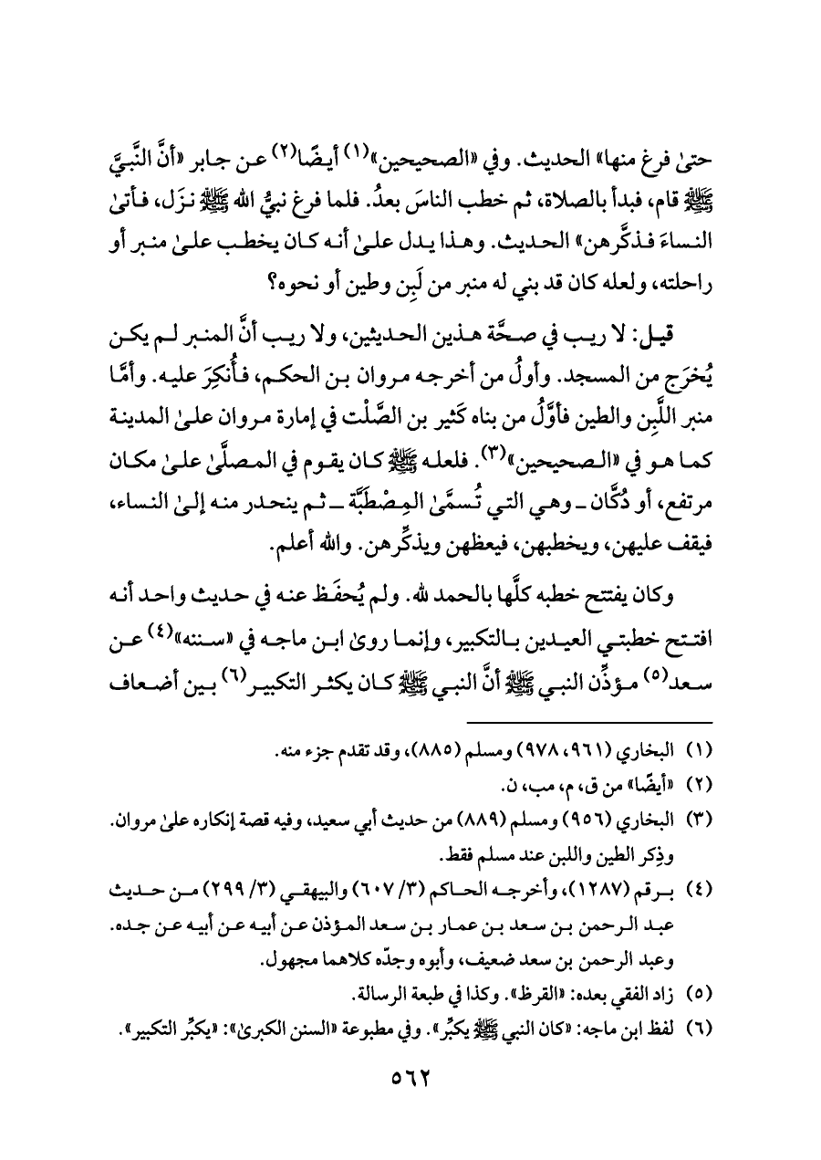 قيل: لا ريب في صحَّة هذين الحديثين، ولا ريب أنَّ المنبر لم يكن يُخرَج من المسجد. وأولُ من أخرجه مروان بن الحكم، فأُنكِرَ عليه. وأمَّا منبر اللَّبِن والطين فأوَّلُ من بناه كَثير بن الصَّلْت في إمارة مروان على المدينة كما هو في «الصحيحين» (¬٣). فلعله - صلى الله عليه وسلم - كان يقوم في المصلَّى على مكان مرتفع، أو دُكَّان ــ وهي التي تُسمَّى المِصْطَبَّة ــ ثم ينحدر منه إلى النساء، فيقف عليهن، ويخطبهن، فيعظهن ويذكِّرهن. والله أعلم.