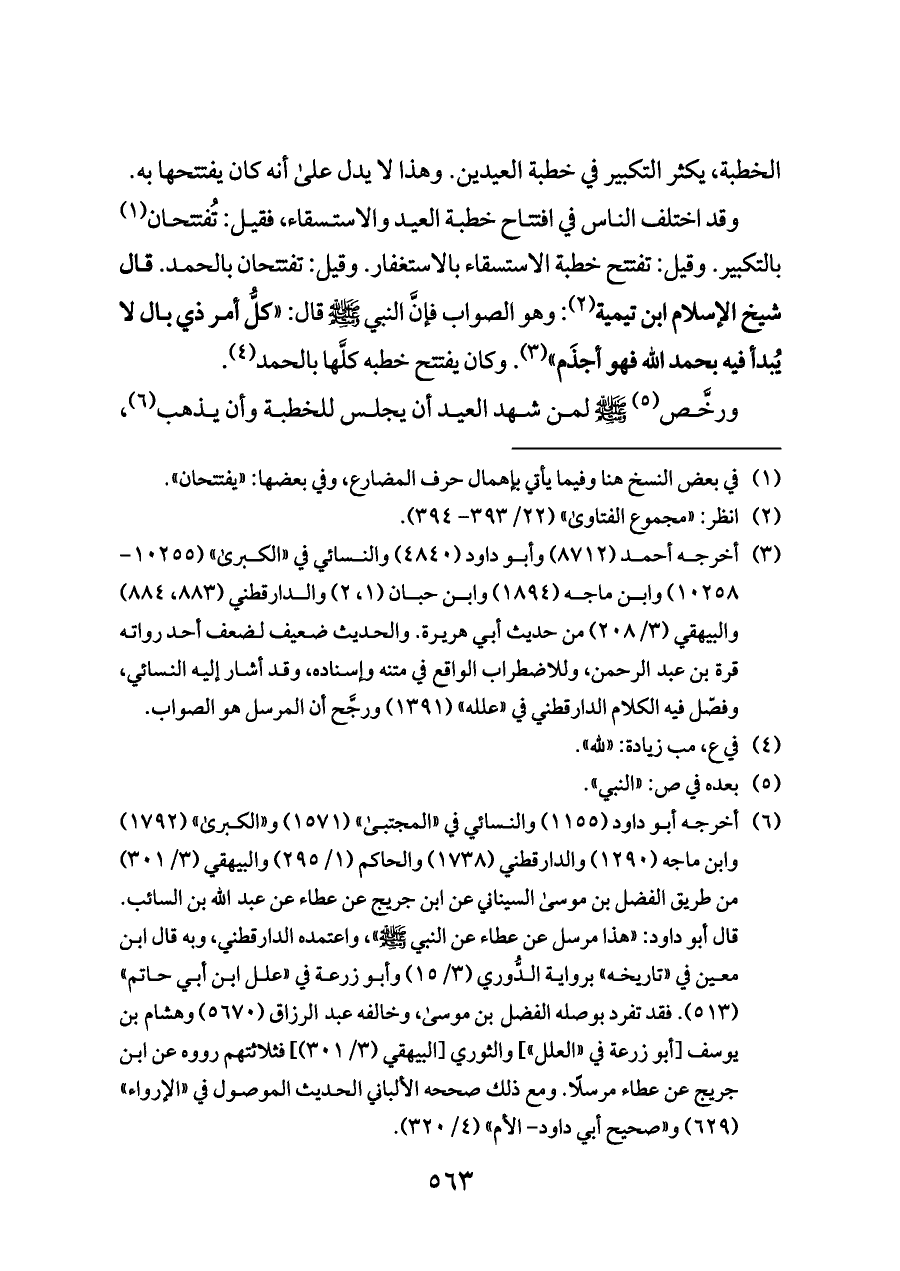 وقد اختلف الناس في افتتاح خطبة العيد والاستسقاء، فقيل: تُفتتحان (¬١) بالتكبير. وقيل: تفتتح خطبة الاستسقاء بالاستغفار. وقيل: تفتتحان بالحمد. قال شيخ الإسلام ابن تيمية (¬٢): وهو الصواب فإنَّ النبي - صلى الله عليه وسلم - قال: «كلُّ أمر ذي بال لا يُبدأ فيه بحمد الله فهو أجذَم» (¬٣). وكان يفتتح خطبه كلَّها بالحمد (¬٤).