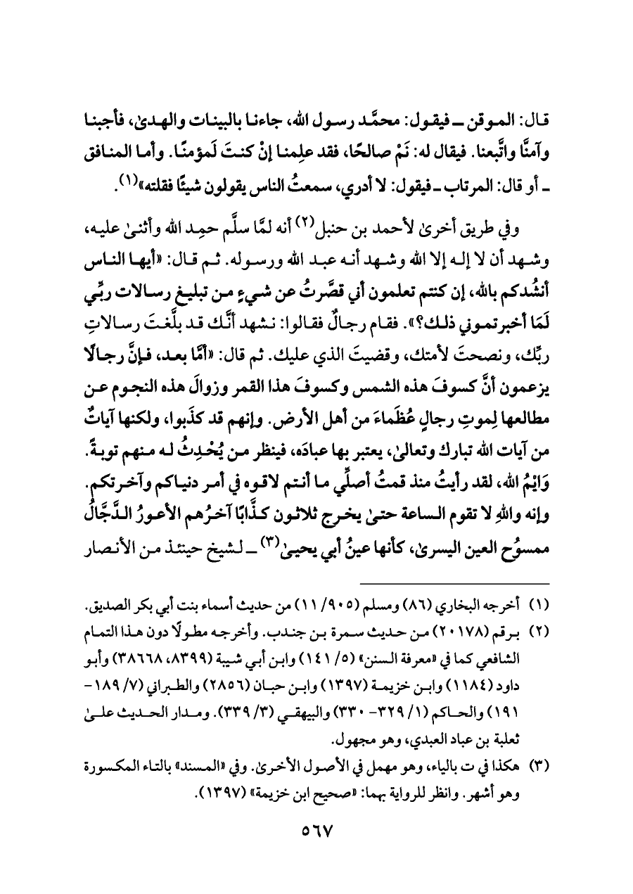 وفي طريق أخرى لأحمد بن حنبل (¬٢) أنه لمَّا سلَّم حمِد الله وأثنى عليه، وشهد أن لا إله إلا الله وشهد أنه عبد الله ورسوله. ثم قال: «أيها الناس أنشُدكم بالله، إن كنتم تعلمون أني قصَّرتُ عن شيءٍ من تبليغ رسالات ربِّي لَمَا أخبرتموني ذلك؟». فقام رجالٌ فقالوا: نشهد أنَّك قد بلَّغتَ رسالاتِ ربِّك، ونصحتَ لأمتك، وقضيتَ الذي عليك. ثم قال: «أمَّا بعد، فإنَّ رجالًا يزعمون أنَّ كسوفَ هذه الشمس وكسوفَ هذا القمر وزوالَ هذه النجوم عن مطالعها لِموتِ رجالٍ عُظَماءَ من أهل الأرض. وإنهم قد كذَبوا، ولكنها آياتٌ من آيات الله تبارك وتعالى، يعتبر بها عبادَه، فينظر من يُحْدِثُ له منهم توبةً. وَايْمُ الله، لقد رأيتُ منذ قمتُ أصلِّي ما أنتم لاقوه في أمر دنياكم وآخرتكم. وإنه واللهِ لا تقوم الساعة حتى يخرج ثلاثون كذَّابًا آخرُهم الأعورُ الدَّجَّالُ ممسوُح العين اليسرى، كأنها عينُ أبي يحيى (¬٣) ــ لشيخ حينئذ من الأنصار