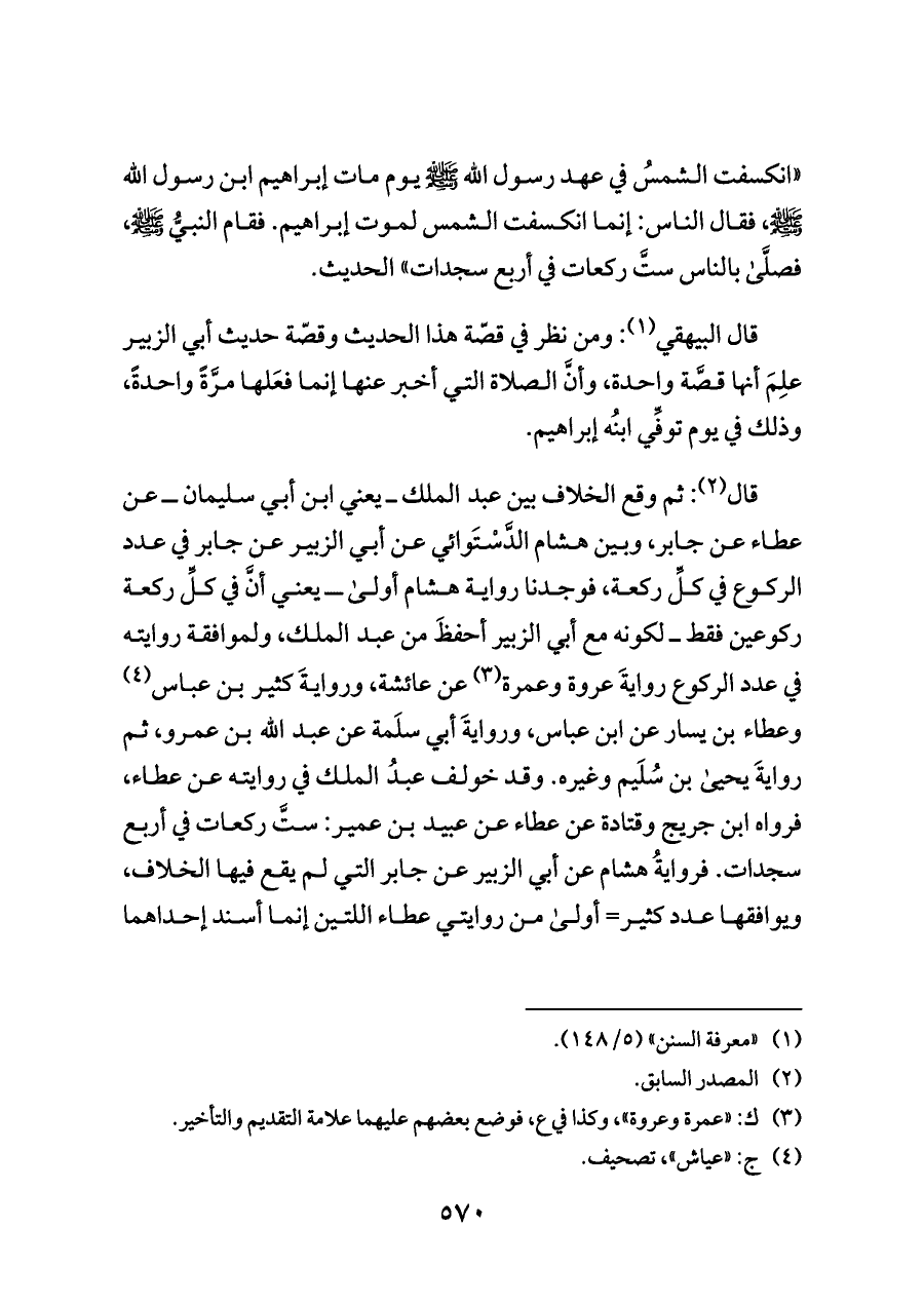 «انكسفت الشمسُ في عهد رسول الله - صلى الله عليه وسلم - يوم مات إبراهيم ابن رسول الله - صلى الله عليه وسلم -، فقال الناس: إنما انكسفت الشمس لموت إبراهيم. فقام النبيُّ - صلى الله عليه وسلم -، فصلَّى بالناس ستَّ ركعات في أربع سجدات» الحديث.