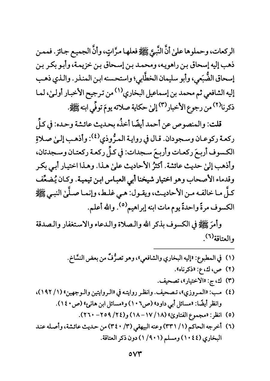 قلت: والمنصوص عن أحمد أيضًا أخذُه بحديث عائشة وحده: في كلِّ ركعة ركوعان وسجودان. قال في رواية المرُّوذي (¬٤): وأذهب إلى صلاةِ الكسوف أربعَ ركعات وأربعَ سجدات: في كلِّ ركعة ركعتان وسجدتان، وأذهب إلى حديث عائشة. أكثرُ الأحاديث على هذا. وهذا اختيار أبي بكر وقدماء الأصحاب وهو اختيار شيخنا أبي العباس ابن تيمية. وكان يُضعِّف كلَّ ما خالفه من الأحاديث، ويقول: هي غلط، وإنما صلَّى النبي - صلى الله عليه وسلم - الكسوف مرةً واحدةً يوم مات ابنه إبراهيم (¬٥). والله أعلم.