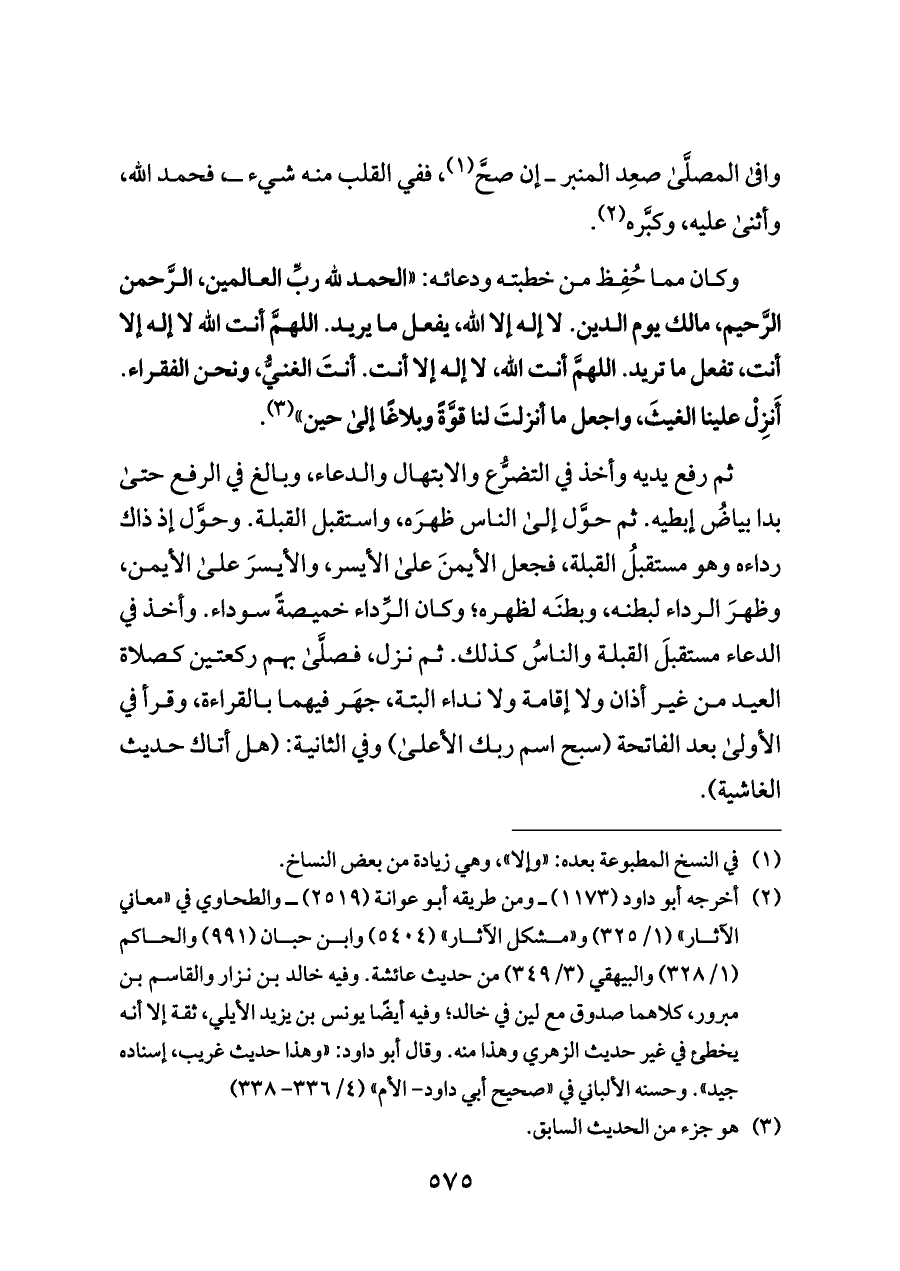 ثم رفع يديه وأخذ في التضرُّع والابتهال والدعاء، وبالغ في الرفع حتى بدا بياضُ إبطيه. ثم حوَّل إلى الناس ظهرَه، واستقبل القبلة. وحوَّل إذ ذاك رداءه وهو مستقبلُ القبلة، فجعل الأيمنَ على الأيسر، والأيسرَ على الأيمن، وظهرَ الرداء لبطنه، وبطنَه لظهره؛ وكان الرِّداء خميصةً سوداء. وأخذ في الدعاء مستقبلَ القبلة والناسُ كذلك. ثم نزل، فصلَّى بهم ركعتين كصلاة العيد من غير أذان ولا إقامة ولا نداء البتة، جهَر فيهما بالقراءة، وقرأ في الأولى بعد الفاتحة (سبح اسم ربك الأعلى) وفي الثانية: (هل أتاك حديث الغاشية).