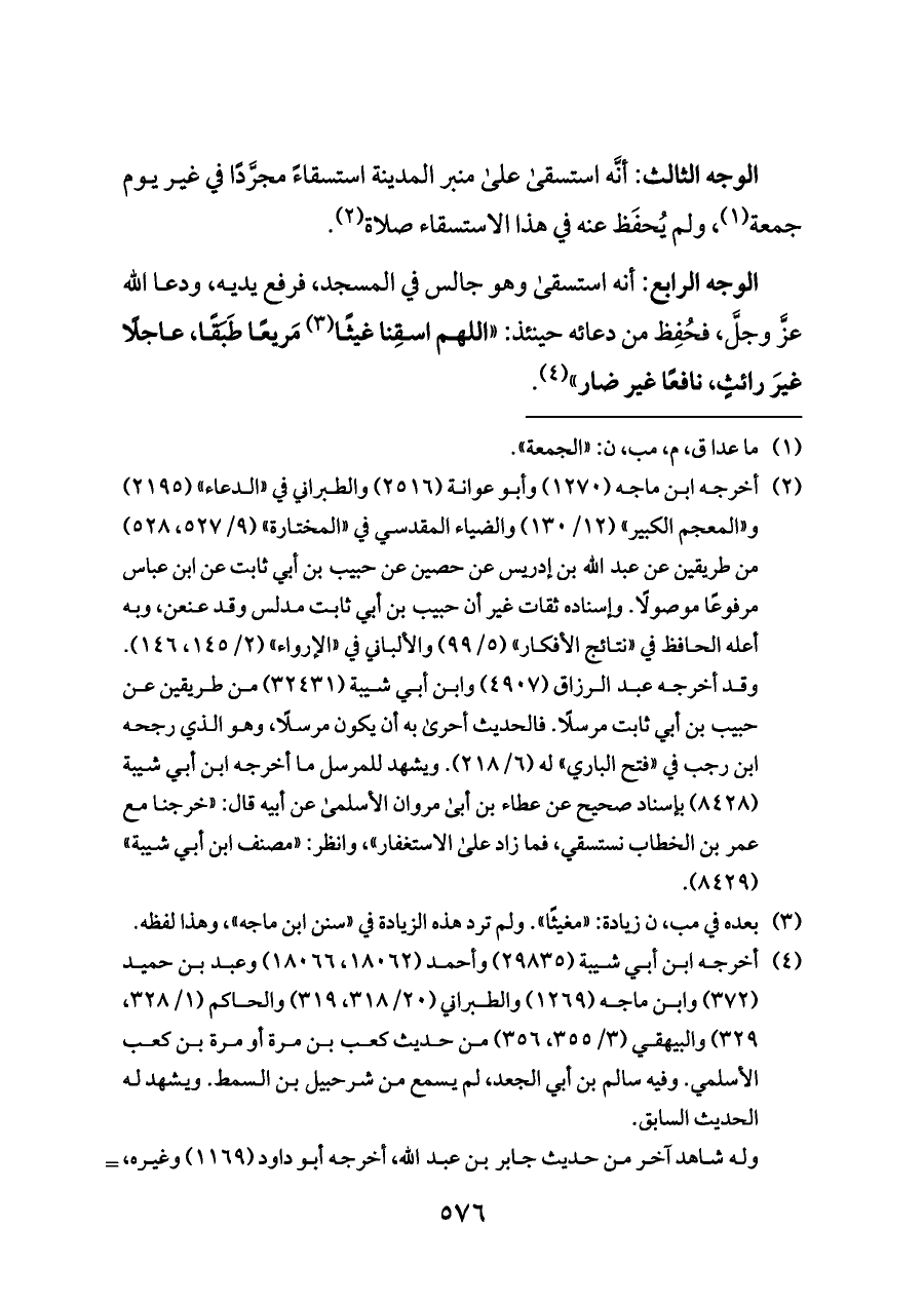 (¬٢) أخرجه ابن ماجه (١٢٧٠) وأبو عوانة (٢٥١٦) والطبراني في «الدعاء» (٢١٩٥) و «المعجم الكبير» (١٢/ ١٣٠) والضياء المقدسي في «المختارة» (٩/ ٥٢٧، ٥٢٨) من طريقين عن عبد الله بن إدريس عن حصين عن حبيب بن أبي ثابت عن ابن عباس مرفوعًا موصولًا. وإسناده ثقات غير أن حبيب بن أبي ثابت مدلس وقد عنعن، وبه أعله الحافظ في «نتائج الأفكار» (٥/ ٩٩) والألباني في «الإرواء» (٢/ ١٤٥، ١٤٦). وقد أخرجه عبد الرزاق (٤٩٠٧) وابن أبي شيبة (٣٢٤٣١) من طريقين عن حبيب بن أبي ثابت مرسلًا. فالحديث أحرى به أن يكون مرسلًا، وهو الذي رجحه ابن رجب في «فتح الباري» له (٦/ ٢١٨). ويشهد للمرسل ما أخرجه ابن أبي شيبة (٨٤٢٨) بإسناد صحيح عن عطاء بن أبى مروان الأسلمى عن أبيه قال: «خرجنا مع عمر بن الخطاب نستسقي، فما زاد على الاستغفار»، وانظر: «مصنف ابن أبي شيبة» (٨٤٢٩).