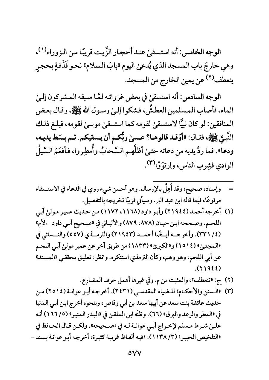 الوجه الخامس: أنه استسقى عند أحجار الزَّيت قريبًا من الزوراء (¬١)، وهي خارجَ باب المسجد الذي يُدعى اليوم «بابَ السلام» نحو قَذْفةٍ بحجرٍ ينعطف (¬٢) عن يمين الخارج من المسجد.