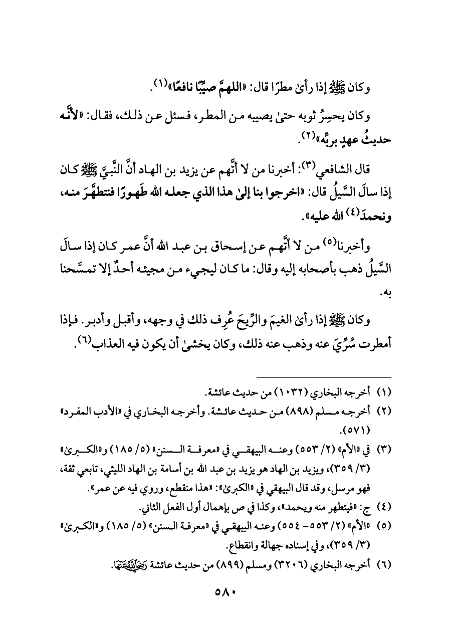 قال الشافعي (¬٣): أخبرنا من لا أتَّهم عن يزيد بن الهاد أنَّ النَّبيَّ - صلى الله عليه وسلم - كان إذا سالَ السَّيلُ قال: «اخرجوا بنا إلى هذا الذي جعله الله طَهورًا فنتطهَّرَ منه، ونحمدَ (¬٤) الله عليه».