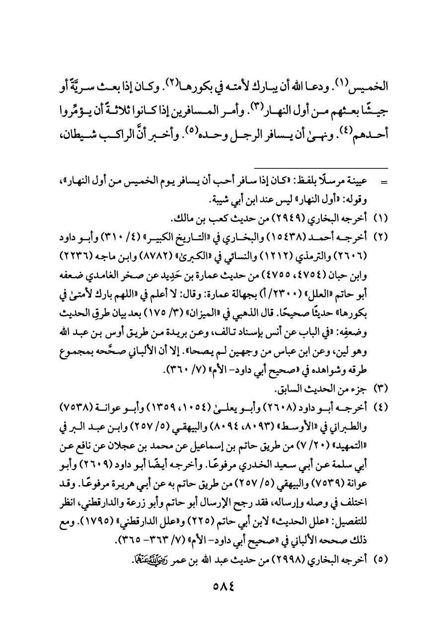(¬٢) أخرجه أحمد (١٥٤٣٨) والبخاري في «التاريخ الكبير» (٤/ ٣١٠) وأبو داود (٢٦٠٦) والترمذي (١٢١٢) والنسائي في «الكبرى» (٨٧٨٢) وابن ماجه (٢٢٣٦) وابن حبان (٤٧٥٤، ٤٧٥٥) من حديث عمارة بن حَدِيد عن صخر الغامدي ضعفه أبو حاتم «العلل» (٢٣٠٠/أ) بجهالة عمارة: وقال: لا أعلم في «اللهم بارك لأمتى في بكورها» حديثًا صحيحًا. قال الذهبي في «الميزان» (٣/ ١٧٥) بعد بيان طرقِ الحديث وضعفِه: «في الباب عن أنس بإسناد تالف، وعن بريدة من طريق أوس بن عبد الله وهو لين، وعن ابن عباس من وجهين لم يصحا». إلا أن الألباني صحَّحه بمجموع طرقه وشواهده في «صحيح أبي داود- الأم» (٧/ ٣٦٠).