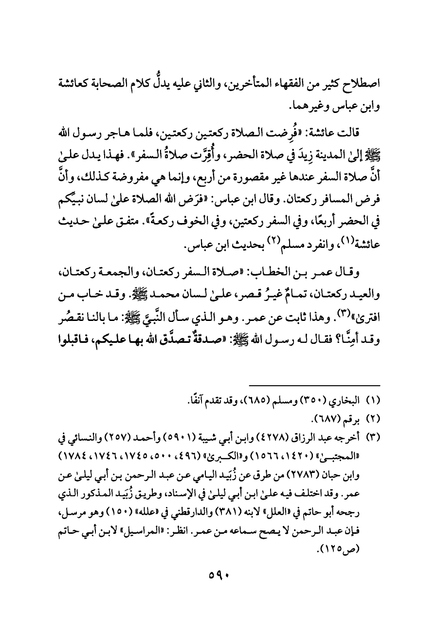 قالت عائشة: «فُرِضت الصلاة ركعتين ركعتين، فلما هاجر رسول الله - صلى الله عليه وسلم - إلى المدينة زِيدَ في صلاة الحضر، وأُقِرَّت صلاةُ السفر». فهذا يدل على أنَّ صلاة السفر عندها غير مقصورة من أربع، وإنما هي مفروضة كذلك، وأنَّ فرض المسافر ركعتان. وقال ابن عباس: «فرَض الله الصلاة على لسان نبيِّكم في الحضر أربعًا، وفي السفر ركعتين، وفي الخوف ركعةً». متفق على حديث عائشة (¬١)، وانفرد مسلم (¬٢) بحديث ابن عباس.