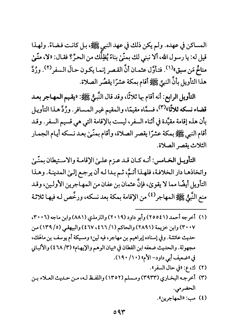 التأويل الرابع: أنه أقام بها ثلاثًا، وقد قال النَّبيُّ - صلى الله عليه وسلم -: «يقيم المهاجر بعد قضاء نسكه ثلاثًا» (¬٣)، فسمَّاه مقيمًا، والمقيم غير المسافر. ورُدَّ هذا التأويل بأن هذه إقامة مقيَّدة في أثناء السفر، ليست بالإقامة التي هي قسيم السفر. وقد أقام النبي - صلى الله عليه وسلم - بمكة عشرًا يقصر الصلاة، وأقام بمنًى بعد نسكه أيام الجمار الثلاث يقصر الصلاة.