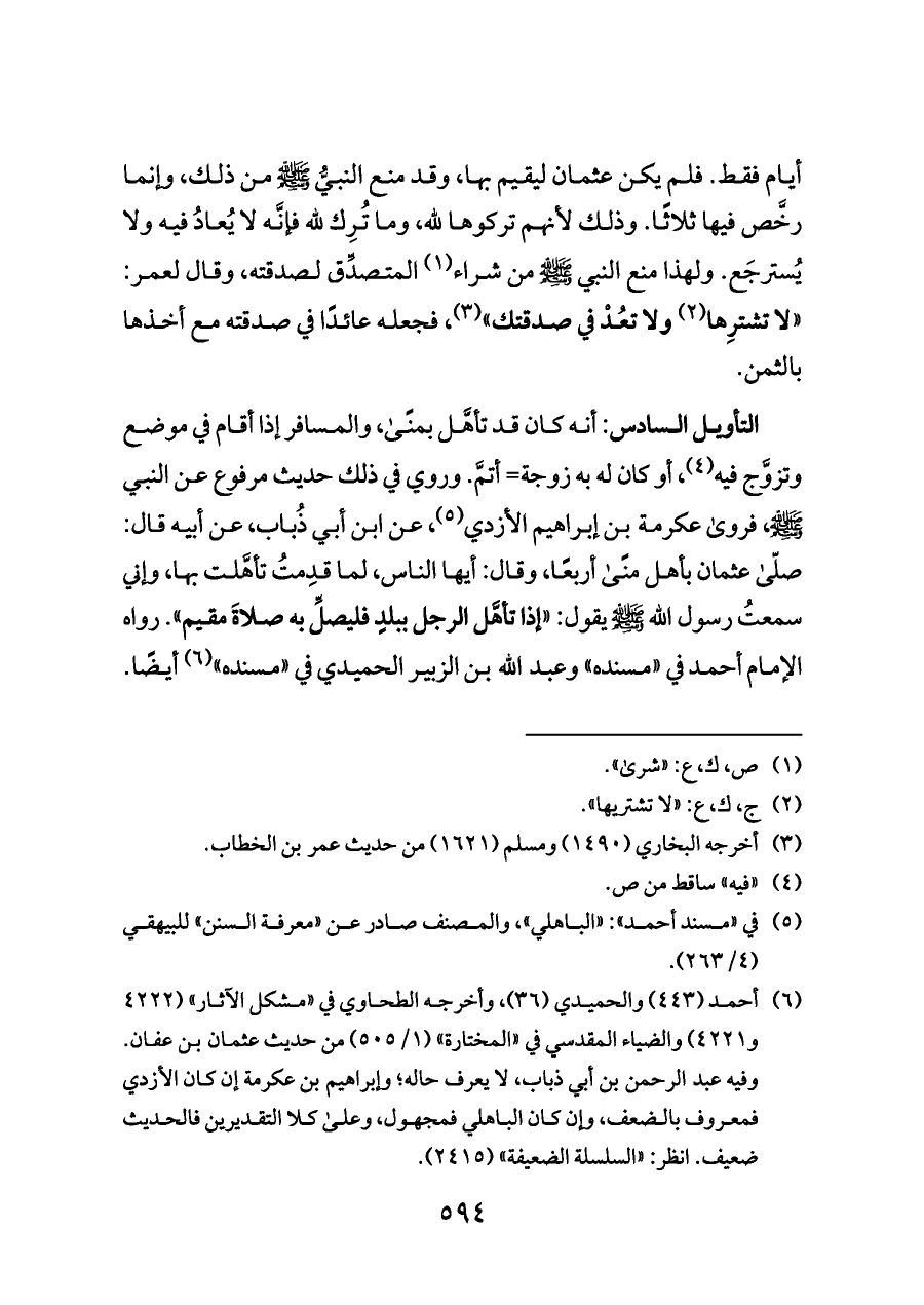التأويل السادس: أنه كان قد تأهَّل بمنًى، والمسافر إذا أقام في موضع وتزوَّج فيه (¬٤)، أو كان له به زوجة= أتمَّ. وروي في ذلك حديث مرفوع عن النبي - صلى الله عليه وسلم -، فروى عكرمة بن إبراهيم الأزدي (¬٥)، عن ابن أبي ذُباب، عن أبيه قال: صلّى عثمان بأهل منًى أربعًا، وقال: أيها الناس، لما قدِمتُ تأهَّلت بها، وإني سمعتُ رسول الله - صلى الله عليه وسلم - يقول: «إذا تأهَّل الرجل ببلدٍ فليصلِّ به صلاةَ مقيم». رواه الإمام أحمد في «مسنده» وعبد الله بن الزبير الحميدي في «مسنده» (¬٦) أيضًا.