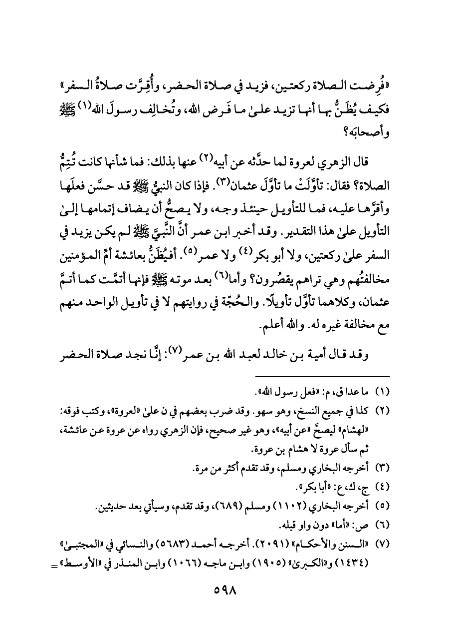 قال الزهري لعروة لما حدَّثه عن أبيه (¬٢) عنها بذلك: فما شأنها كانت تُتِمُّ الصلاة؟ فقال: تأوَّلَتْ ما تأوَّلَ عثمان (¬٣). فإذا كان النبيُّ - صلى الله عليه وسلم - قد حسَّن فعلَها وأقرَّها عليه، فما للتأويل حينئذ وجه، ولا يصحُّ أن يضاف إتمامها إلى التأويل على هذا التقدير. وقد أخبر ابن عمر أنَّ النَّبيَّ - صلى الله عليه وسلم - لم يكن يزيد في السفر على ركعتين، ولا أبو بكر (¬٤) ولا عمر (¬٥). أفيُظَنُّ بعائشة أمِّ المؤمنين مخالفتُهم وهي تراهم يقصُرون؟ وأما (¬٦) بعد موته - صلى الله عليه وسلم - فإنها أتمَّت كما أتمَّ عثمان، وكلاهما تأوَّل تأويلًا. والحُجّة في روايتهم لا في تأويل الواحد منهم مع مخالفة غيره له. والله أعلم.
