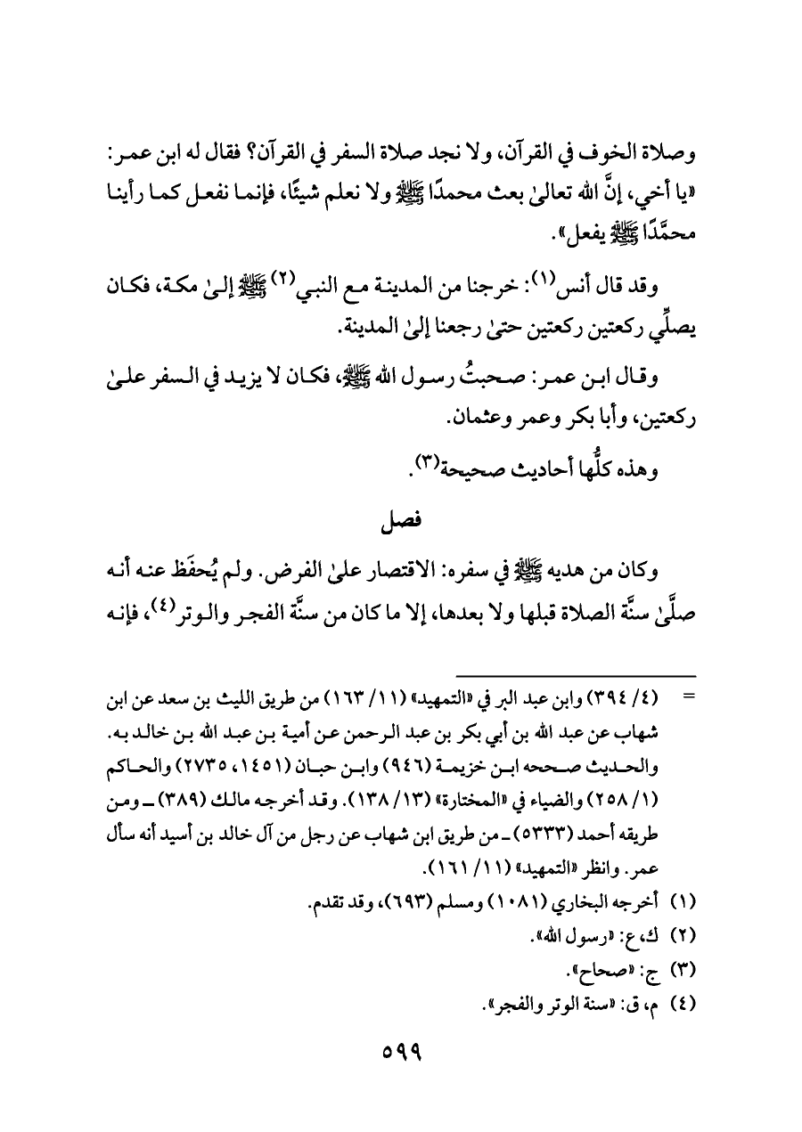 وكان من هديه - صلى الله عليه وسلم - في سفره: الاقتصار على الفرض. ولم يُحفَظ عنه أنه صلَّى سنَّة الصلاة قبلها ولا بعدها، إلا ما كان من سنَّة الفجر والوتر (¬٤)، فإنه