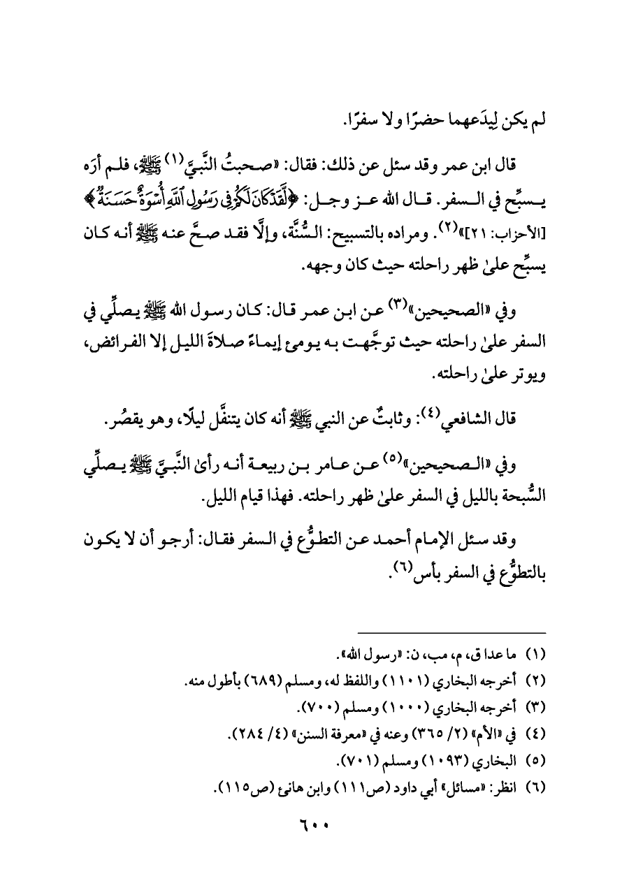 قال ابن عمر وقد سئل عن ذلك: فقال: «صحبتُ النَّبيَّ (¬١) - صلى الله عليه وسلم -، فلم أرَه يسبِّح في السفر. قال الله عز وجل: {لَقَدْ كَانَ لَكُمْ فِي رَسُولِ اللَّهِ أُسْوَةٌ حَسَنَةٌ} [الأحزاب: ٢١]» (¬٢). ومراده بالتسبيح: السُّنَّة، وإلَّا فقد صحَّ عنه - صلى الله عليه وسلم - أنه كان يسبِّح على ظهر راحلته حيث كان وجهه.