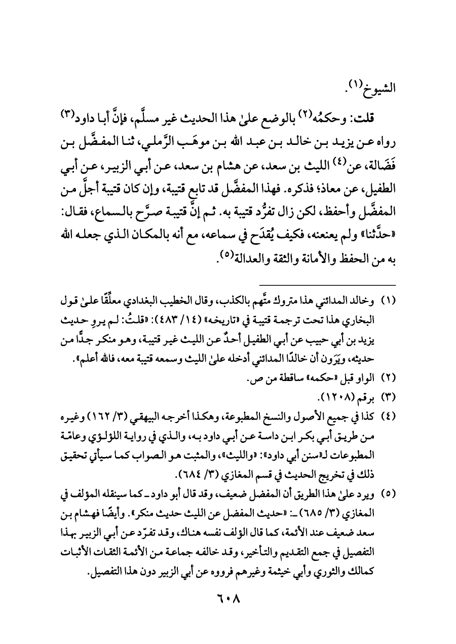 (¬٥) ويرد على هذا الطريق أن المفضل ضعيف، وقد قال أبو داود ــ كما سينقله المؤلف في المغازي (٣/ ٦٨٥) ــ: «حديث المفضل عن الليث حديث منكر». وأيضًا فهشام بن سعد ضعيف عند الأئمة، كما قال الؤلف نفسه هناك، وقد تفرّد عن أبي الزبير بهذا التفصيل في جمع التقديم والتأخير، وقد خالفه جماعة من الأئمة الثقات الأثبات كمالك والثوري وأبي خيثمة وغيرهم فرووه عن أبي الزبير دون هذا التفصيل.