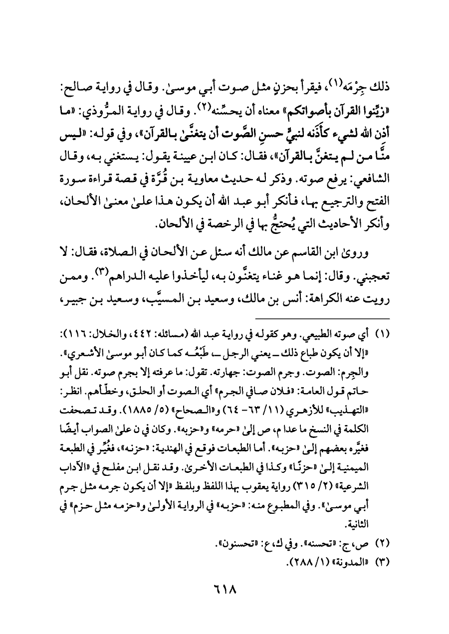 (¬١) أي صوته الطبيعي. وهو كقوله في رواية عبد الله (مسائله: ٤٤٢، والخلال: ١١٦): «إلا أن يكون طباع ذلك ــ يعني الرجل ــ، طَبْعُه كما كان أبو موسى الأشعري». والجِرم: الصوت. وجرم الصوت: جهارته. تقول: ما عرفته إلا بجرم صوته. نقل أبو حاتم قول العامة: «فلان صافي الجرم» أي الصوت أو الحلق، وخطّأهم. انظر: «التهذيب» للأزهري (١١/ ٦٣ - ٦٤) و «الصحاح» (٥/ ١٨٨٥). وقد تصحفت الكلمة في النسخ ما عدا م، ص إلى «حرمه» و «حزبه». وكان في ن على الصواب أيضًا فغيَّره بعضهم إلى «حزبه». أما الطبعات فوقع في الهندية: «حزنه»، فغُيِّر في الطبعة الميمنية إلى «حزنًا» وكذا في الطبعات الأخرى. وقد نقل ابن مفلح في «الآداب الشرعية» (٢/ ٣١٥) رواية يعقوب بهذا اللفظ وبلفظ «إلا أن يكون جرمه مثل جرم أبي موسى». وفي المطبوع منه: «حزبه» في الرواية الأولى و «حزمه مثل حزم» في الثانية.
