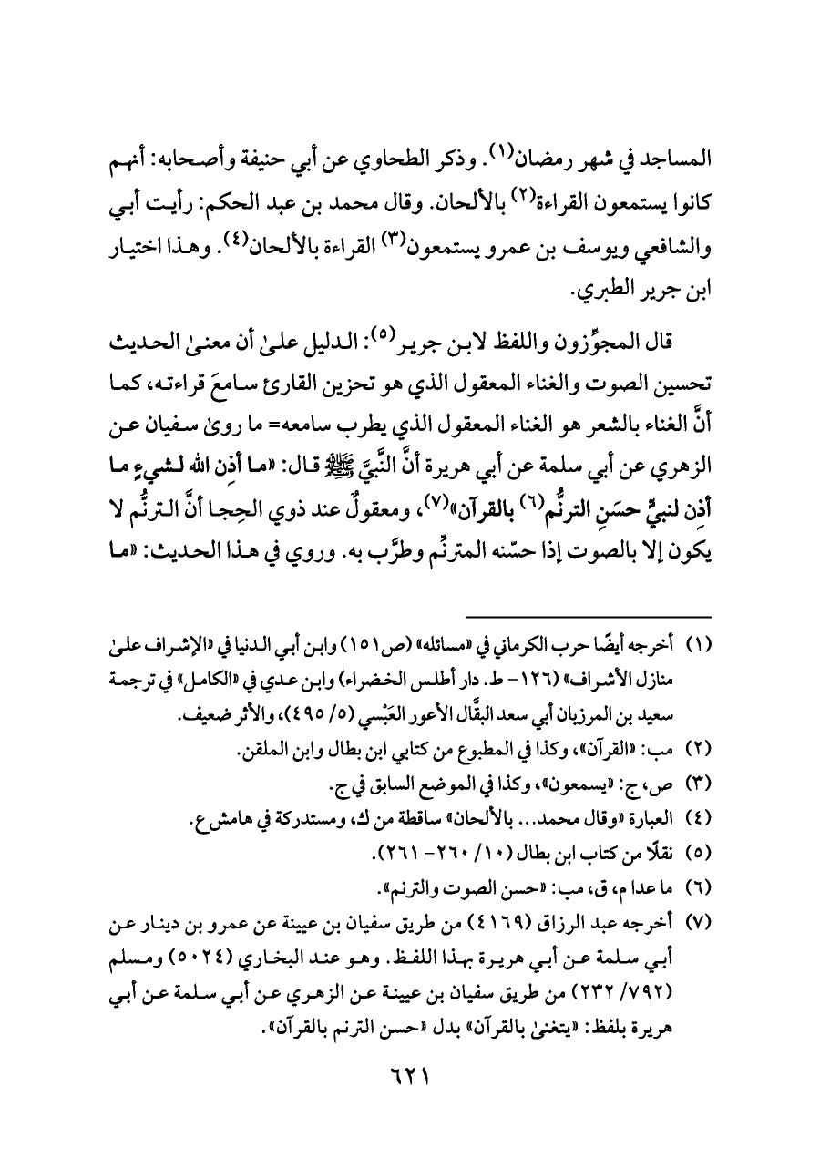 المساجد في شهر رمضان (¬١). وذكر الطحاوي عن أبي حنيفة وأصحابه: أنهم كانوا يستمعون القراءة (¬٢) بالألحان. وقال محمد بن عبد الحكم: رأيت أبي والشافعي ويوسف بن عمرو يستمعون (¬٣) القراءة بالألحان (¬٤). وهذا اختيار ابن جرير الطبري.