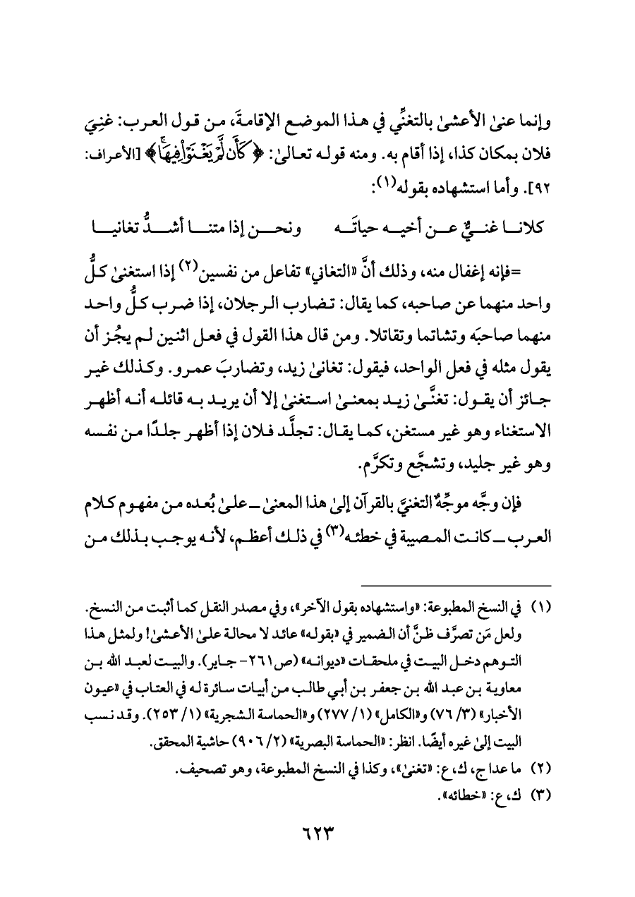وإنما عنى الأعشى بالتغنِّي في هذا الموضع الإقامةَ، من قول العرب: غنِيَ فلان بمكان كذا، إذا أقام به. ومنه قوله تعالى: {كَأَنْ لَمْ يَغْنَوْا فِيهَا} [الأعراف: ٩٢]. وأما استشهاده بقوله (¬١):