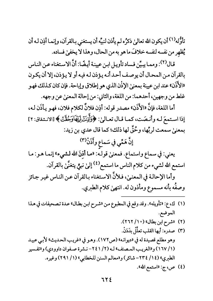 قال (¬٢): ومما يبيِّن فساد تأويل ابن عيينة أيضًا: أنَّ الاستغناء عن الناس بالقرآن من المحال أن يوصف أحد أنه يؤذن له فيه أو لا يؤذن، إلا أن يكون «الأَذَن» عند ابن عيينة بمعنى الإذْن الذي هو إطلاق وإباحة. فإن كان كذلك فهو غلط من وجهين، أحدهما: من اللغة، والثاني: من إحالة المعنى عن وجهه.