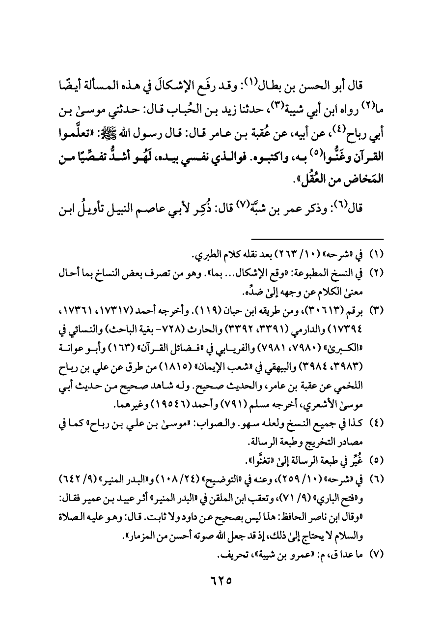 قال أبو الحسن بن بطال (¬١): وقد رفَع الإشكالَ في هذه المسألة أيضًا ما (¬٢) رواه ابن أبي شيبة (¬٣)، حدثنا زيد بن الحُباب قال: حدثني موسى بن أبي رباح (¬٤)، عن أبيه، عن عُقبة بن عامر قال: قال رسول الله - صلى الله عليه وسلم -: «تعلَّموا القرآن وغَنُّوا (¬٥) به، واكتبوه. فوالذي نفسي بيده، لَهُو أشدُّ تفصِّيًا من المَخاض من العُقُل».