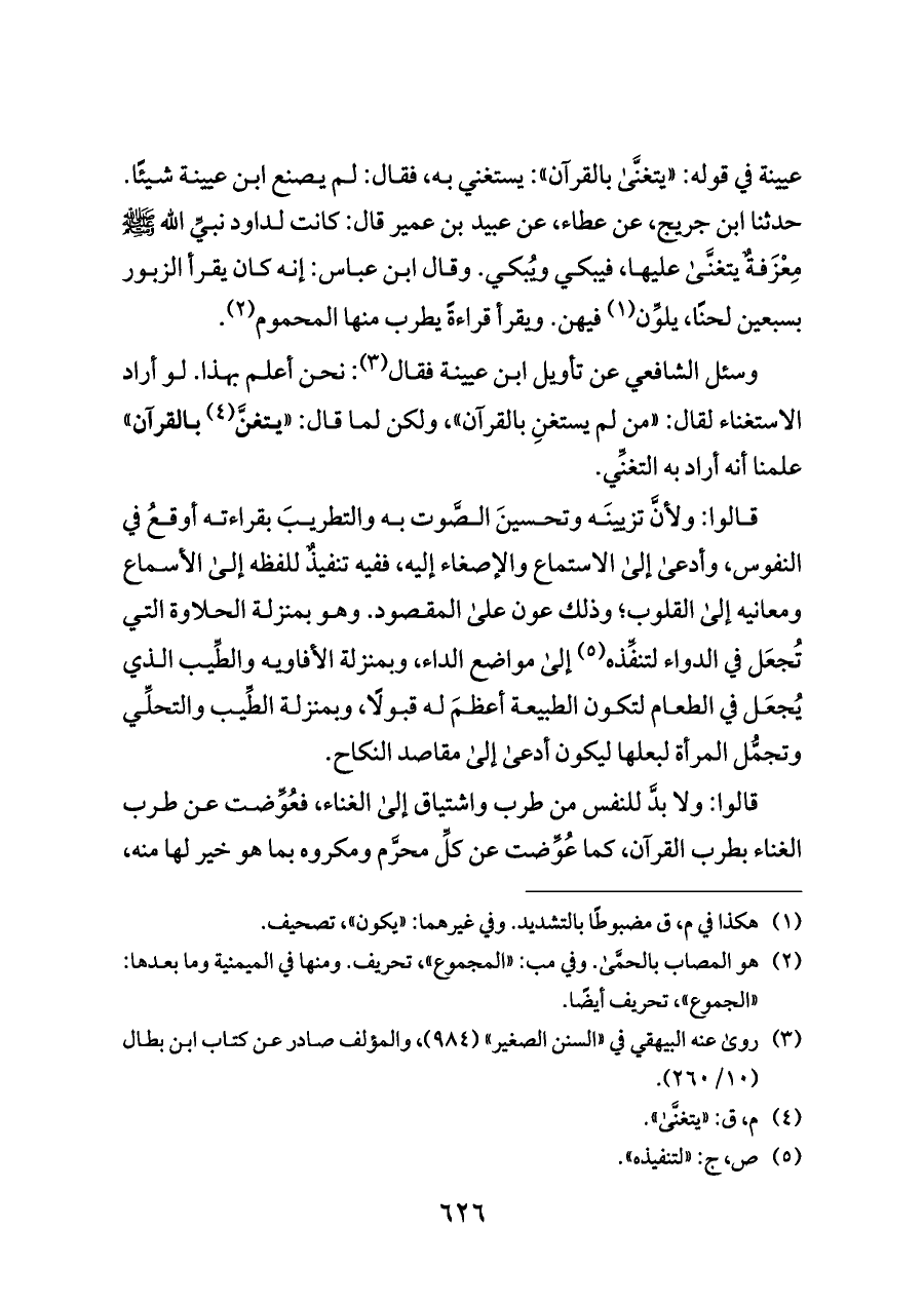 وسئل الشافعي عن تأويل ابن عيينة فقال (¬٣): نحن أعلم بهذا. لو أراد الاستغناء لقال: «من لم يستغنِ بالقرآن»، ولكن لما قال: «يتغنَّ (¬٤) بالقرآن» علمنا أنه أراد به التغنِّي.