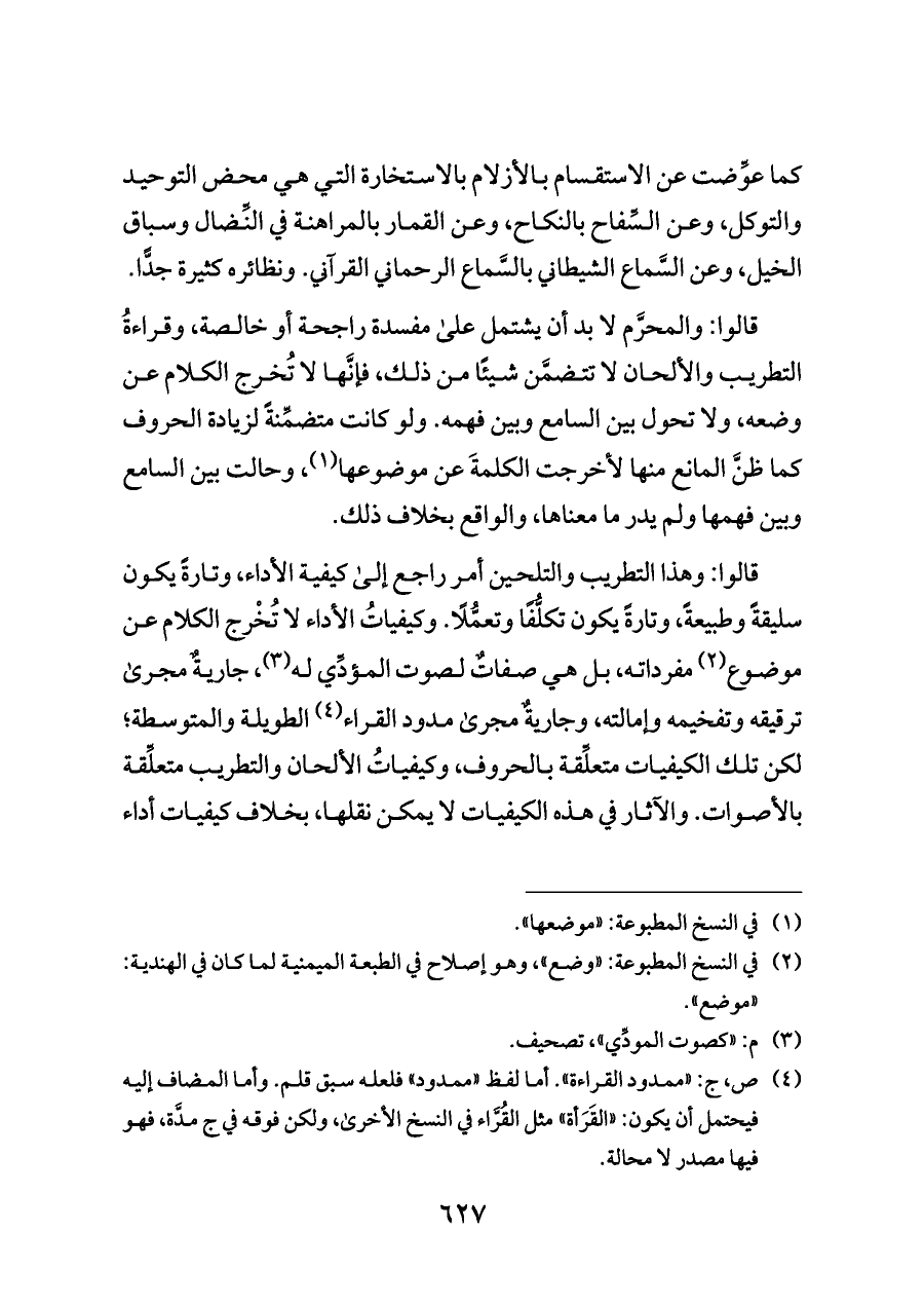 قالوا: وهذا التطريب والتلحين أمر راجع إلى كيفية الأداء، وتارةً يكون سليقةً وطبيعةً، وتارةً يكون تكلُّفًا وتعمُّلًا. وكيفياتُ الأداء لا تُخْرج الكلام عن موضوع (¬٢) مفرداته، بل هي صفاتٌ لصوت المؤدِّي له (¬٣)، جاريةٌ مجرى ترقيقه وتفخيمه وإمالته، وجاريةٌ مجرى مدود القراء (¬٤) الطويلة والمتوسطة؛ لكن تلك الكيفيات متعلِّقة بالحروف، وكيفياتُ الألحان والتطريب متعلِّقة بالأصوات. والآثار في هذه الكيفيات لا يمكن نقلها، بخلاف كيفيات أداء