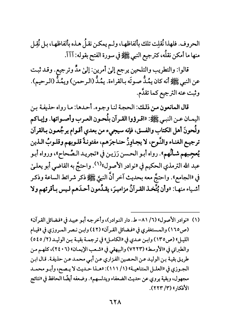 قال المانعون من ذلك: الحجة لنا وجوه. أحدها: ما رواه حذيفة بن اليمان عن النبي - صلى الله عليه وسلم -: «اقرؤوا القرآن بلُحون العرب وأصواتها. وإياكم ولُحونَ أهل الكتاب والفسق، فإنه سيجيء من بعدي أقوام يرجِّعون بالقرآن ترجيع الغناء والنَّوح، لا يجاوِزُ حناجرَهم، مفتونةً قلوبهم وقلوبُ الذين يُعجِبهم شأنُهم». رواه أبو الحسن رَزين في «تجريد الصِّحاح»، ورواه أبو عبد الله الترمذي الحكيم في «نوادر الأصول» (¬١). واحتجَّ به القاضي أبو يعلى في «الجامع». واحتجَّ معه بحديث آخر أنَّ النبيَّ - صلى الله عليه وسلم - ذكر شرائط الساعة وذكر أشياء منها: «وأن يُتَّخذ القرآنُ مزاميرَ، يقدِّمون أحدَهم ليس بأقرئهم ولا