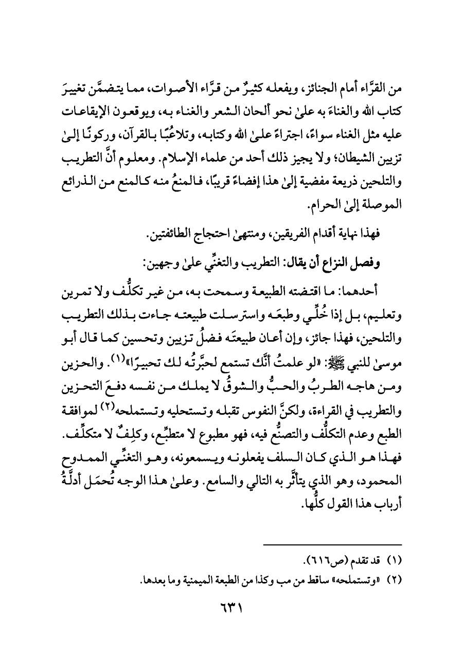 من القرَّاء أمام الجنائز، ويفعله كثيرٌ من قرَّاء الأصوات، مما يتضمَّن تغييرَ كتاب الله والغناءَ به على نحو ألحان الشعر والغناء به، ويوقعون الإيقاعات عليه مثل الغناء سواءً، اجتراءً على الله وكتابه، وتلاعُبًا بالقرآن، وركونًا إلى تزيين الشيطان؛ ولا يجيز ذلك أحد من علماء الإسلام. ومعلوم أنَّ التطريب والتلحين ذريعة مفضية إلى هذا إفضاءً قريبًا، فالمنعُ منه كالمنع من الذرائع الموصلة إلى الحرام.